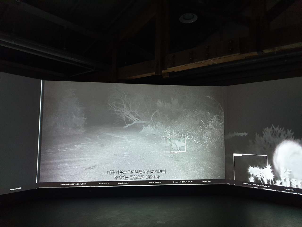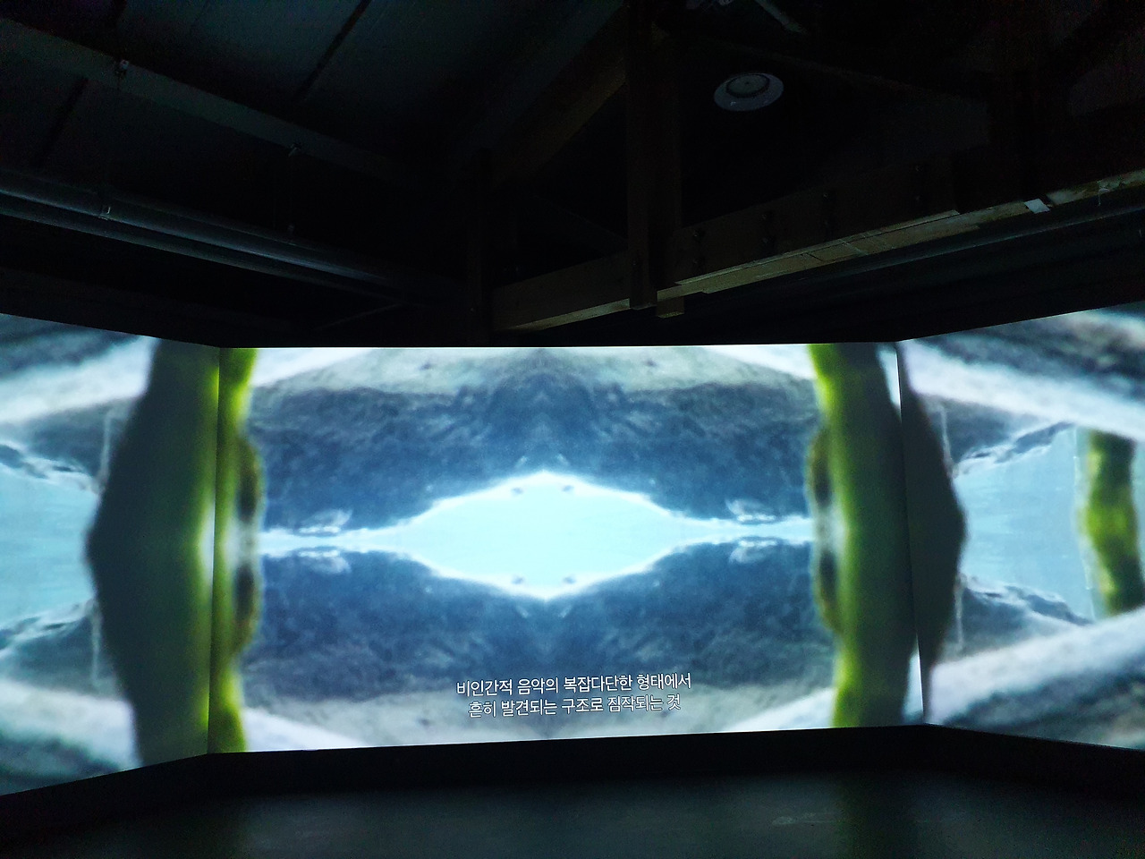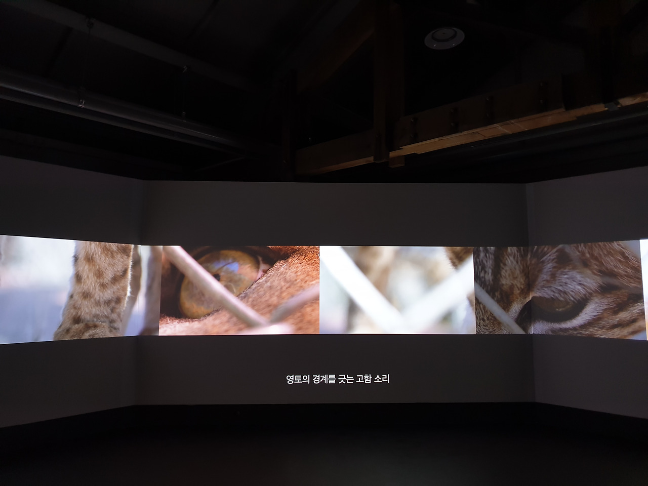 ‘타니아 칸디아니(Tania Candiani)’의 <동물을 위하여>는 여섯 종의 동물 소리, 암반층의 소리를 통해 ‘동물들을 위한 자장가’로 사용했으며 작가 자신이 편집하여 만든 기계음과 목소리, 텍스트와 중첩하여 동물·지질·기계가 내는 소리의 공명을 만들어냈다. 이러한 과정을 다큐멘터리 형식으로 감상할 수 있는데, 인간이 만들어내는 소리가 비인간인 존재들에게는 폭력적인 소음이었을지도 모르겠다는 생각의 전환으로 다가온 작업이다.