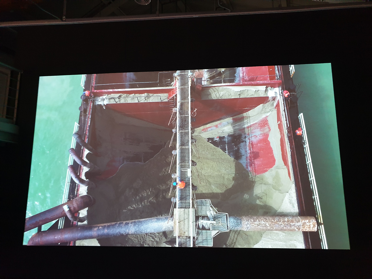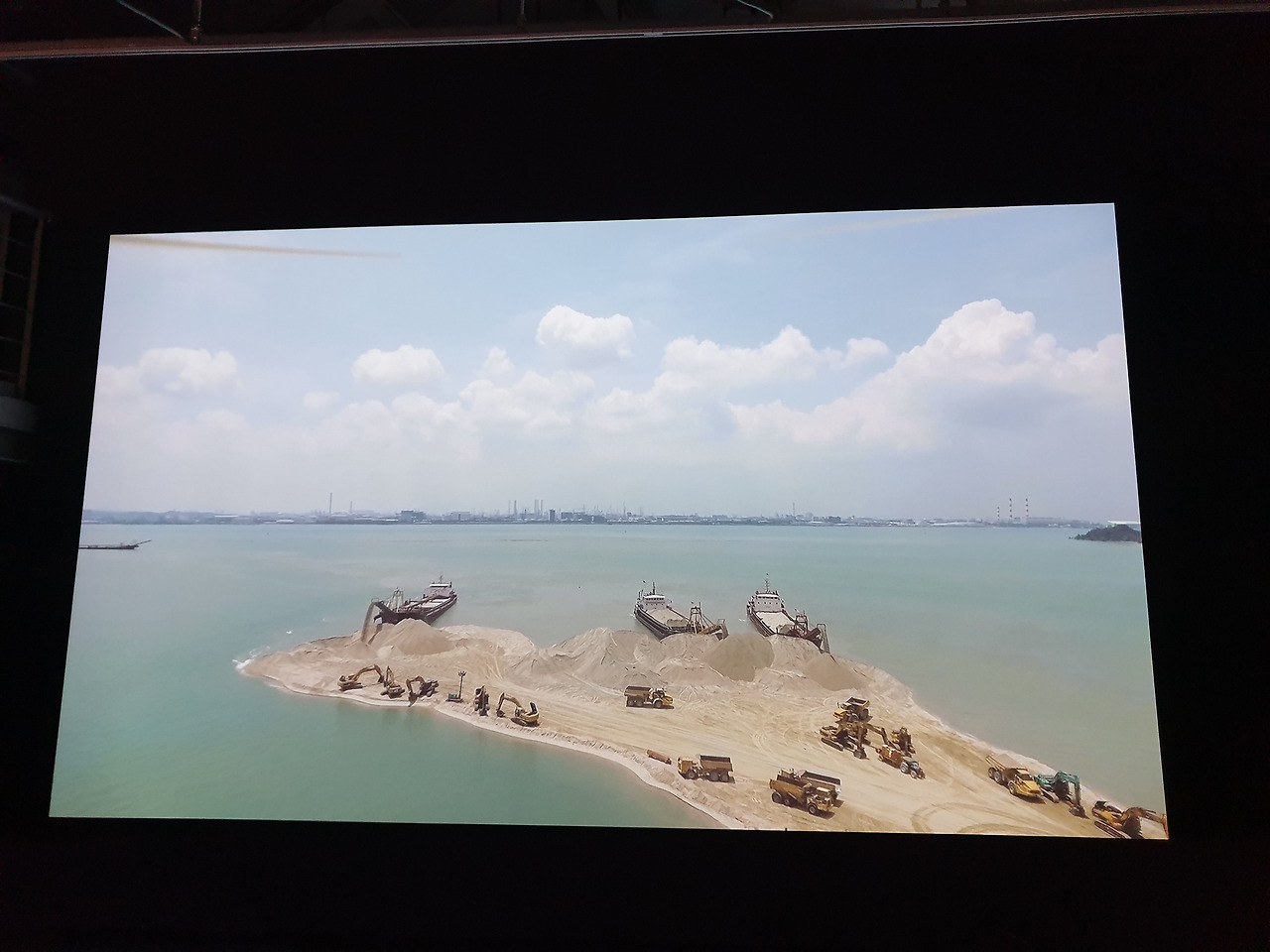 인천아트플랫폼 B 전시실 벽면에 재생되고 있는 ‘찰스 림 이 용(Charles Lim Yi Yong)’의 <씨 스테이트(SEA STATE)> 프로젝트는 일반인들이 쉽게 접근할 수 없는 간척의 현장을 드론을 이용해 가감 없이 보여준다. 간척사업은 대체로 바다를 높디높은 펜스로 가린 채 진행하기 때문에 일반인들이 두 눈으로 그 현장을 확인하기는 어렵다. 불편한 것은 가리고 싶어 하는 인간의 본성이 드러나는 장면이 아닐까 싶다. 영상 속 바다에 뿌려지는 헤아릴 수 없는 양의 모래를 보고 있으면 자연의 형태마저도 바꿔버리는 국가의 힘 앞에 개인은 일종의 무기력에 빠지게 된다. 더 무서운 건 특정한 공간에 채워지는 모래를 보고 있으면 예술적 황홀경이나 정돈된 규칙성에 의해 마음이 편안해진다는 점이다. 자연을 인위적으로 바꾸는 것에 대한 인간으로서 느낄 수 있는 최후의 양심은 이미 우리의 유전자 속에서 사라져버린 것인지도 모르겠다.