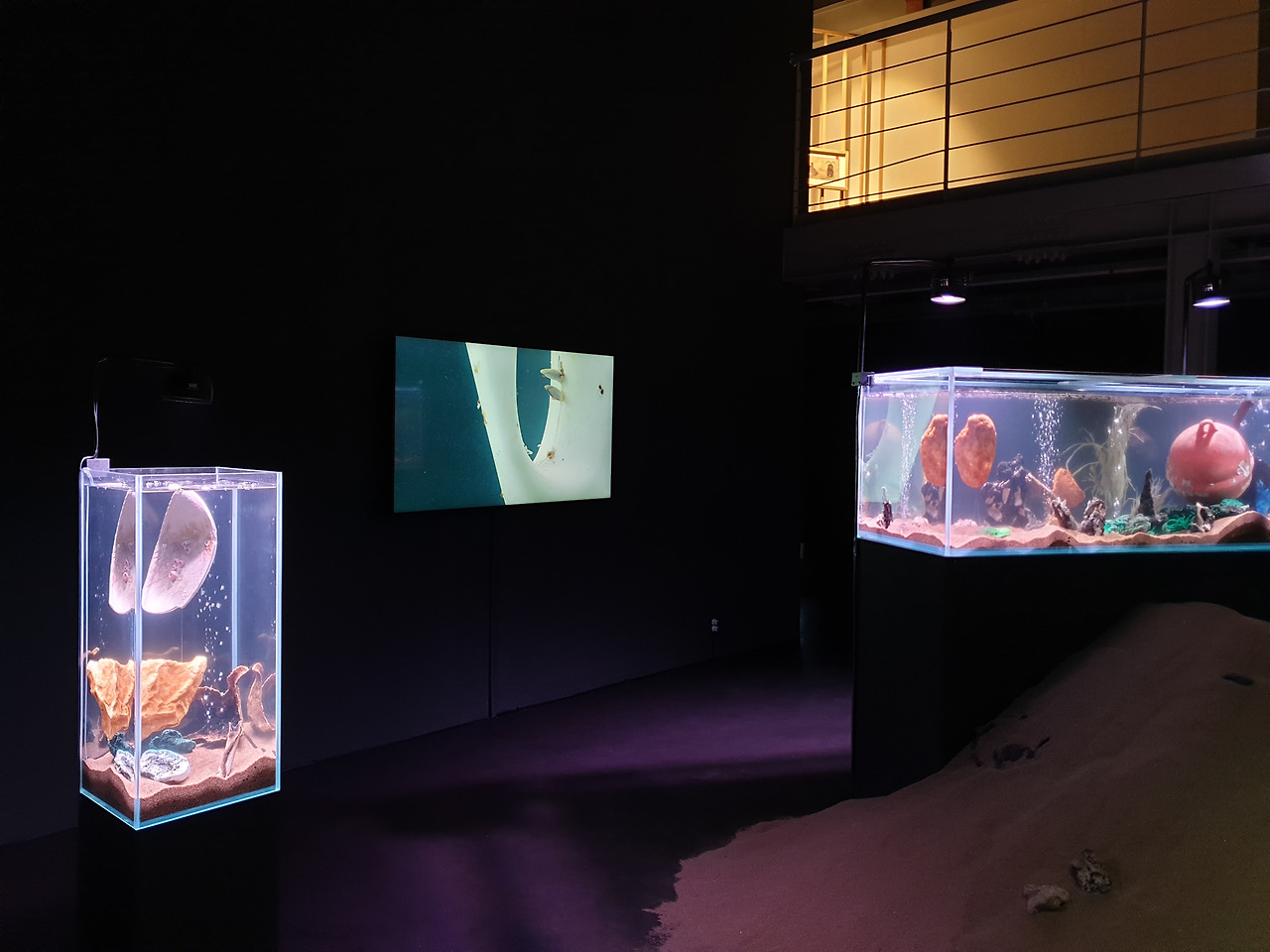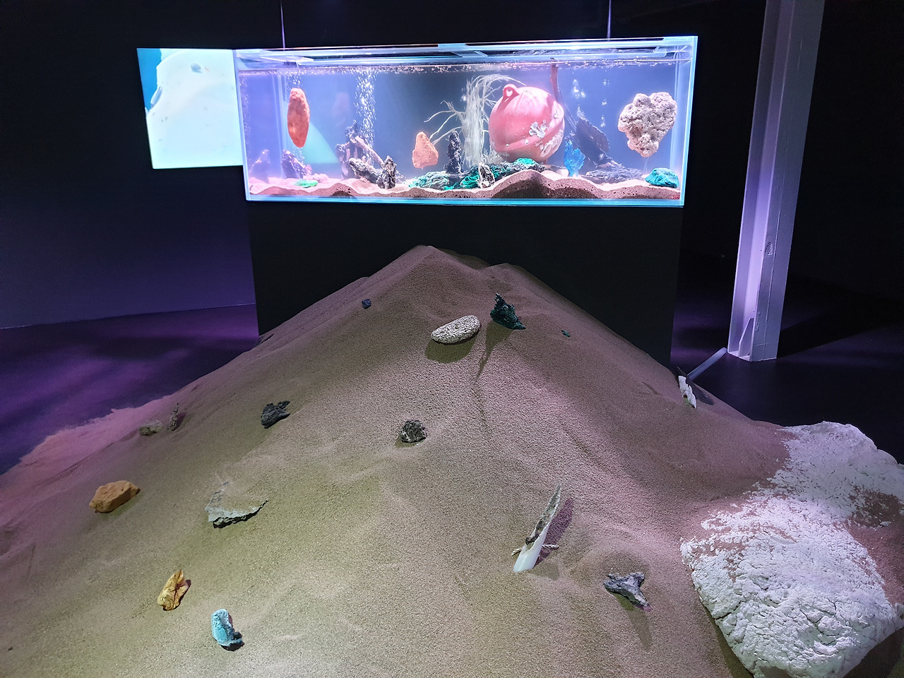 국제적 생태환경 포럼을 개최하여 ‘탄소 제로’ 등의 정책적 해결 방안을 마련하는 것은 지금의 상황에 가장 큰 책임이 있는 세계 각 정부와 다국적기업이 마땅히 해야 할 일임에는 틀림이 없다. 하지만 민간의 영역에서는 국제 포럼, OO 선언, 탄소 제로 등은 삶에서 피부로 와닿지 않는 것이 현실이다. 오히려 수조 속에 있는 ‘뉴 락’을 플라스틱으로 인지하지 못하는 체험이 개개인에게 더 큰 울림을 줄 수 있을 것이다. 이것이 생태환경이 예술을 만나야 하는 이유가 아닐까. 장한나 작가가 수집한 뉴 락을 표본화한 작업과 사진 연작 <기묘한 낯선> 그리고 채집하여 작업하고 연구하는 공간을 구성한 <뉴 락 연구자의 작업실>은 윈도 갤러리 형태로 E3 전시실에 별도로 마련되어 있다.