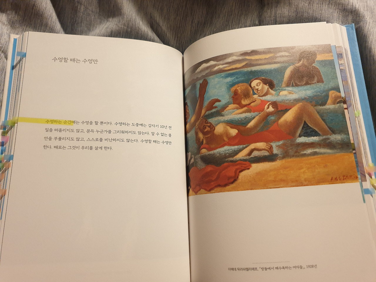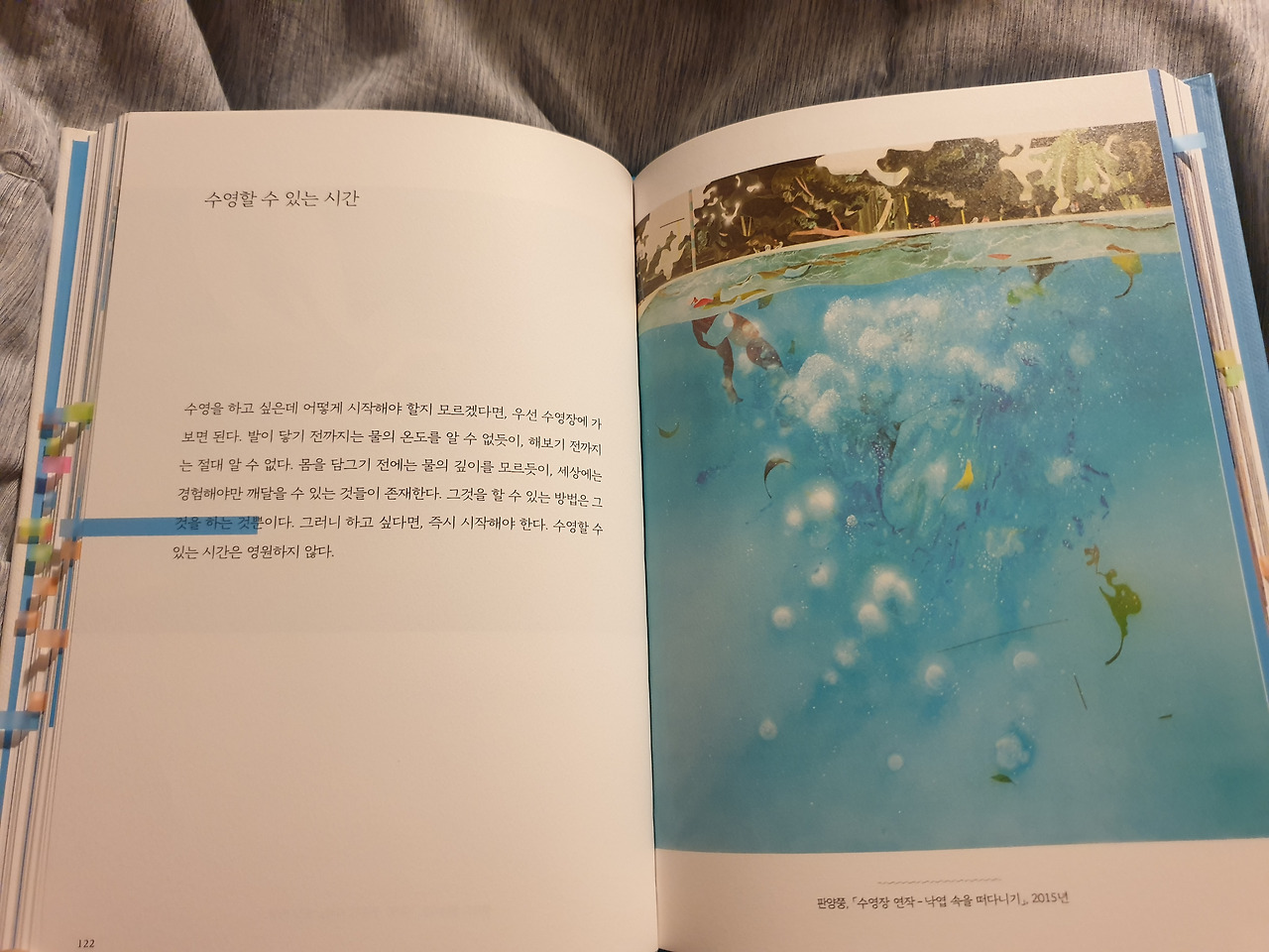 물속에 있을 때 물과 닿는 촉감 외의 모든 감각이 아득히 멀어져 가는 경험을 다들 해보았을 것이다. 물이라는 존재가 나를 세상과 분리시켜 주어 '내'가 '나'로 오롯이 존재할 수 있는 시간과 공간을 제공해주는 것이다. 책 제목 <풍덩! 완전한 휴식 속으로>가 얼마나 잘 지어져 있는 재목인지 무릎을 탁하고 치게 된다.