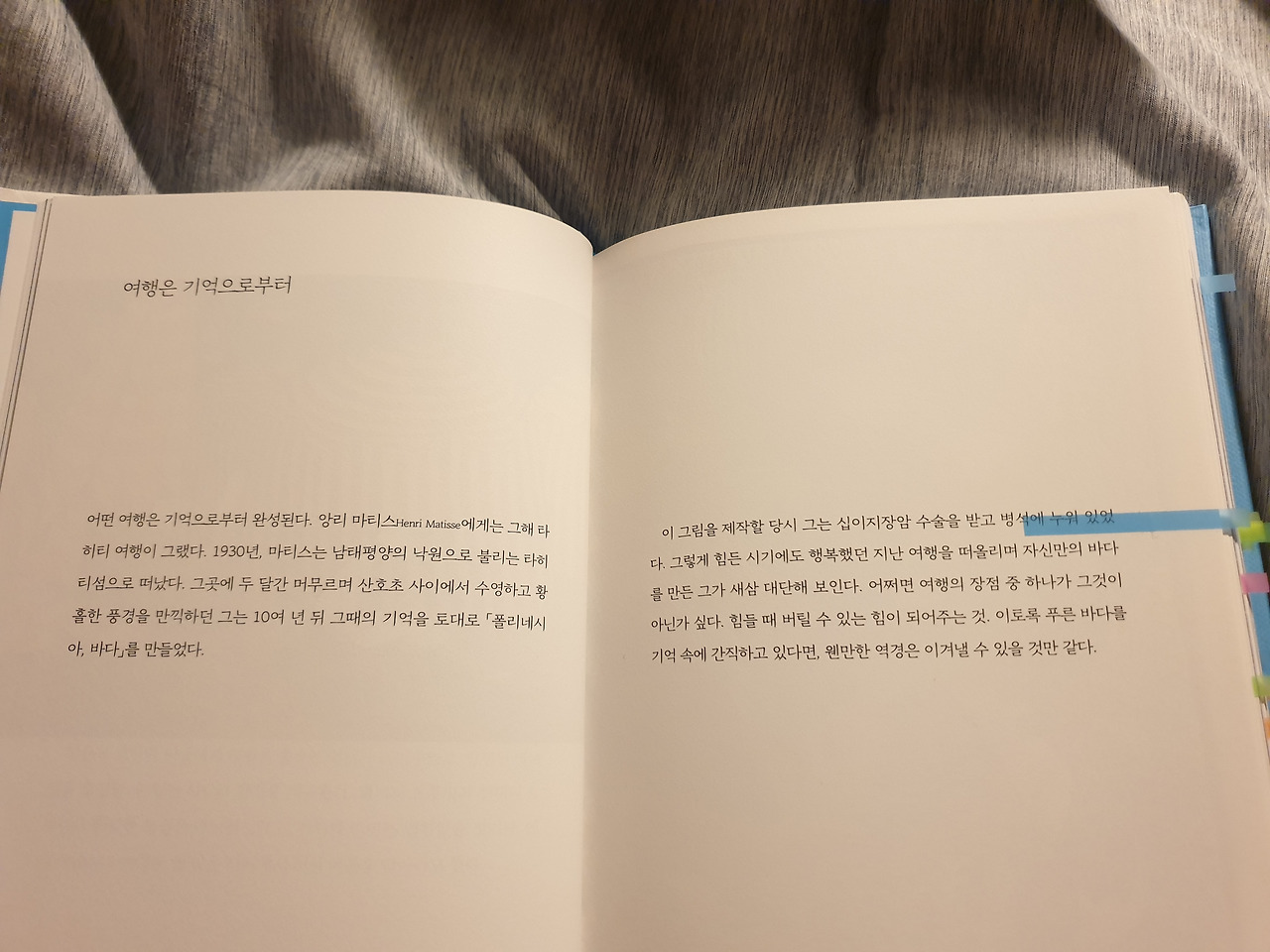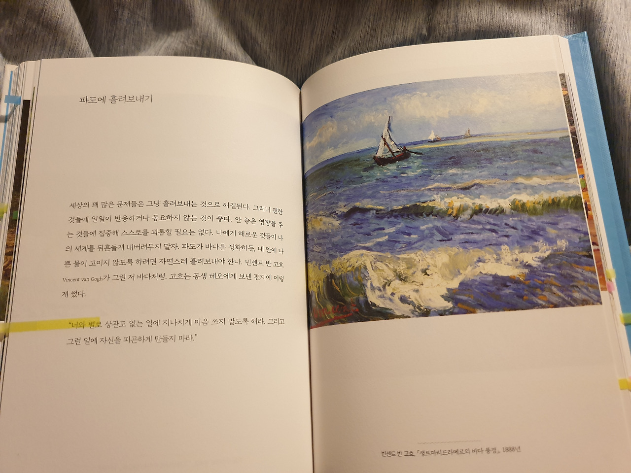 이 책은 읽는다와 본다의 비슷하지만 완전히 다른 두 가지의 경험을 모두 제공해준다. 글만으로도 충분히 내 일상을 조금 내려놓을 수 있는 용기를 얻게 해 주지만, 함께 놓여지는 그림을 보면 그 이상의 뭉클함을 경험하게 된다.