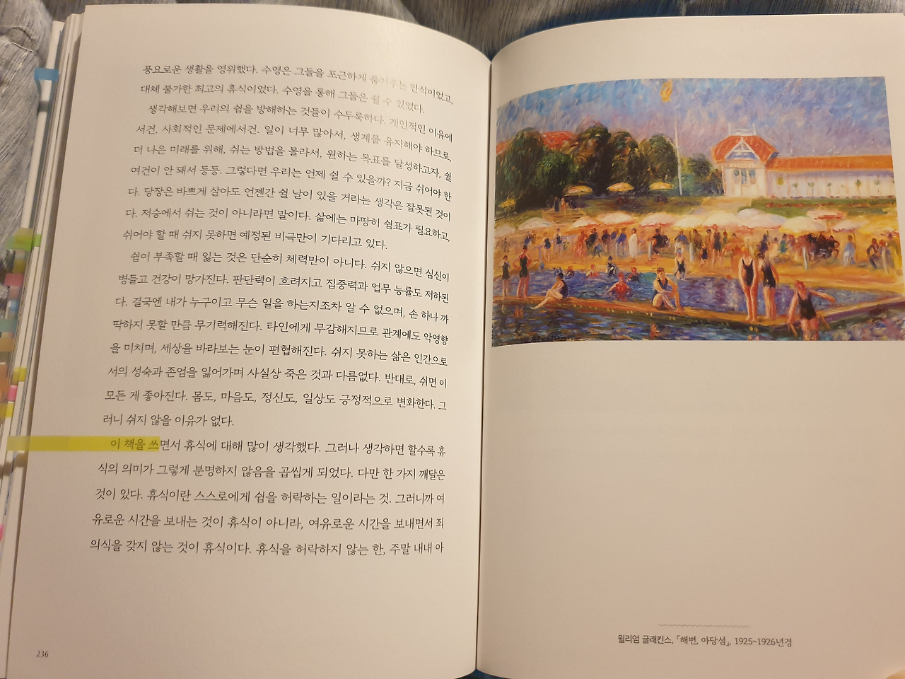 호크니, 고갱, 마티스, 졸리, 쇠라, 뒤피, 클림트 등 이름만으로도 그림이 떠오르는 작가들이 '수영'이라는 행위를 삶에서 어떤 의미로 삼았는지 그리고 이를 그들의 그림에 어떻게 투영했는지를 알아보는 과정은 엄청난 미학적 즐거움을 제공한다.