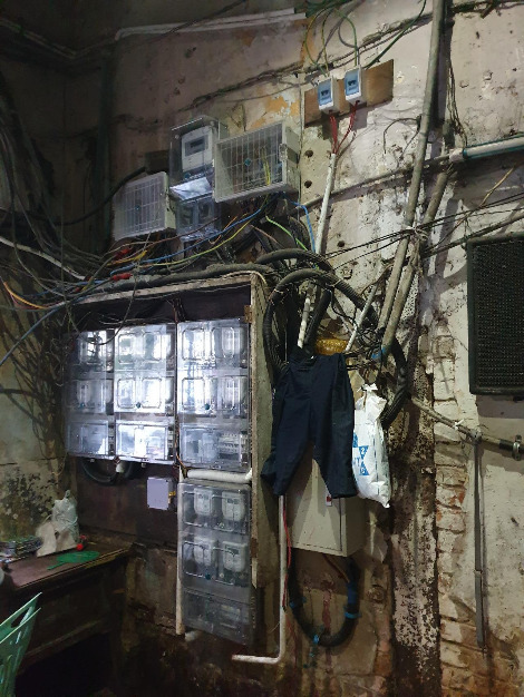 레스토랑으로 들어가는 1층 입구에는 시선을 강탈하는 것이 있었다. 우리가 흔히 '두꺼비집'이라 부르는 배전함이었는데, 그대로 노출되어 있는 전선이며, 열려 있는 배전함 뚜껑이며, 한데 얽혀 있는 전깃줄과 호스(수도 호스로 추정)도 놀라웠지만 전깃줄에 아무렇게 널려 있는 젖은 바지는 정말 압권이었다.