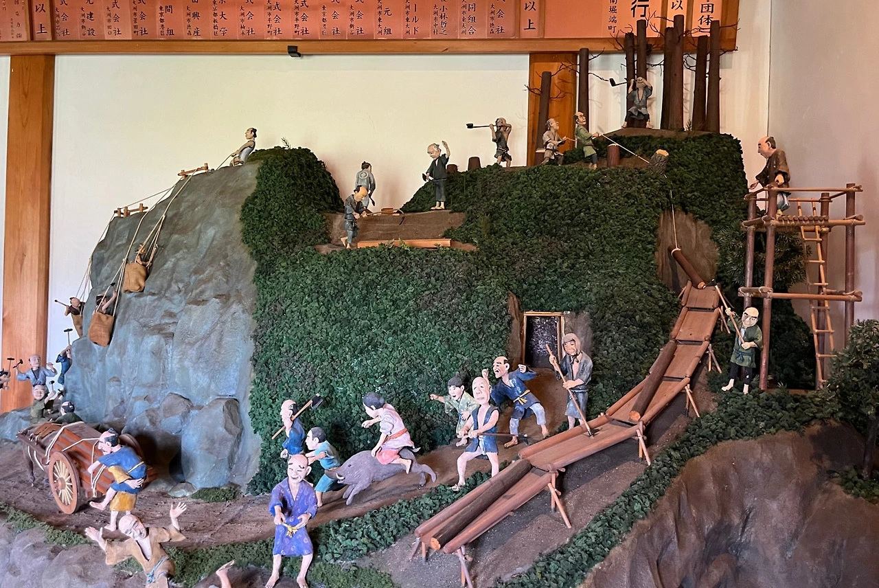 두 번째 미니어처는 토도 타카토라가 시작해서 와키자카 야스하루가 완성한 천수각의 건조 모습을 재연했다. 당시 공사에 동원됐던 백성의 수가 굉장히 많았고, 그들의 고혈을 빨아 천수각이 지어졌던 것이다.