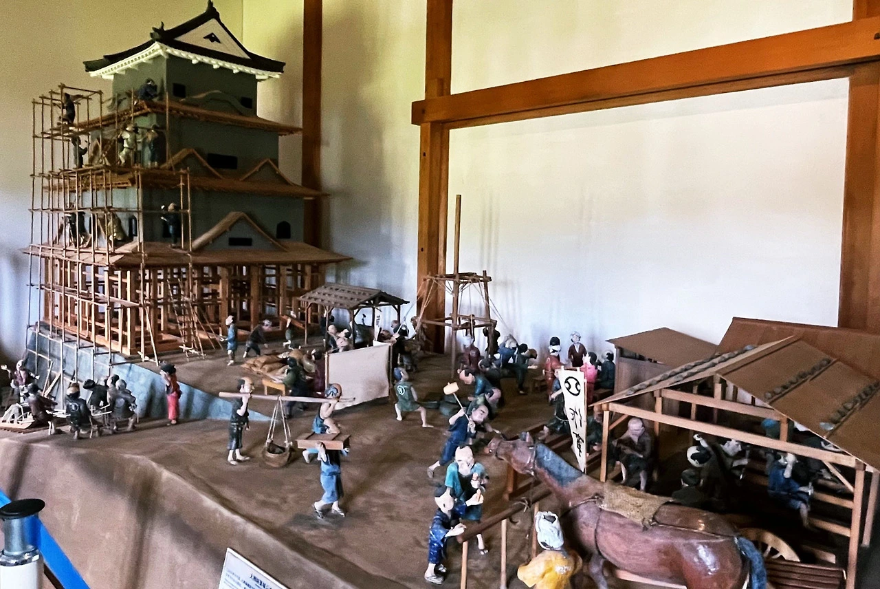 오즈성 천수각의 축조 모습을 재연하는 미니어처.