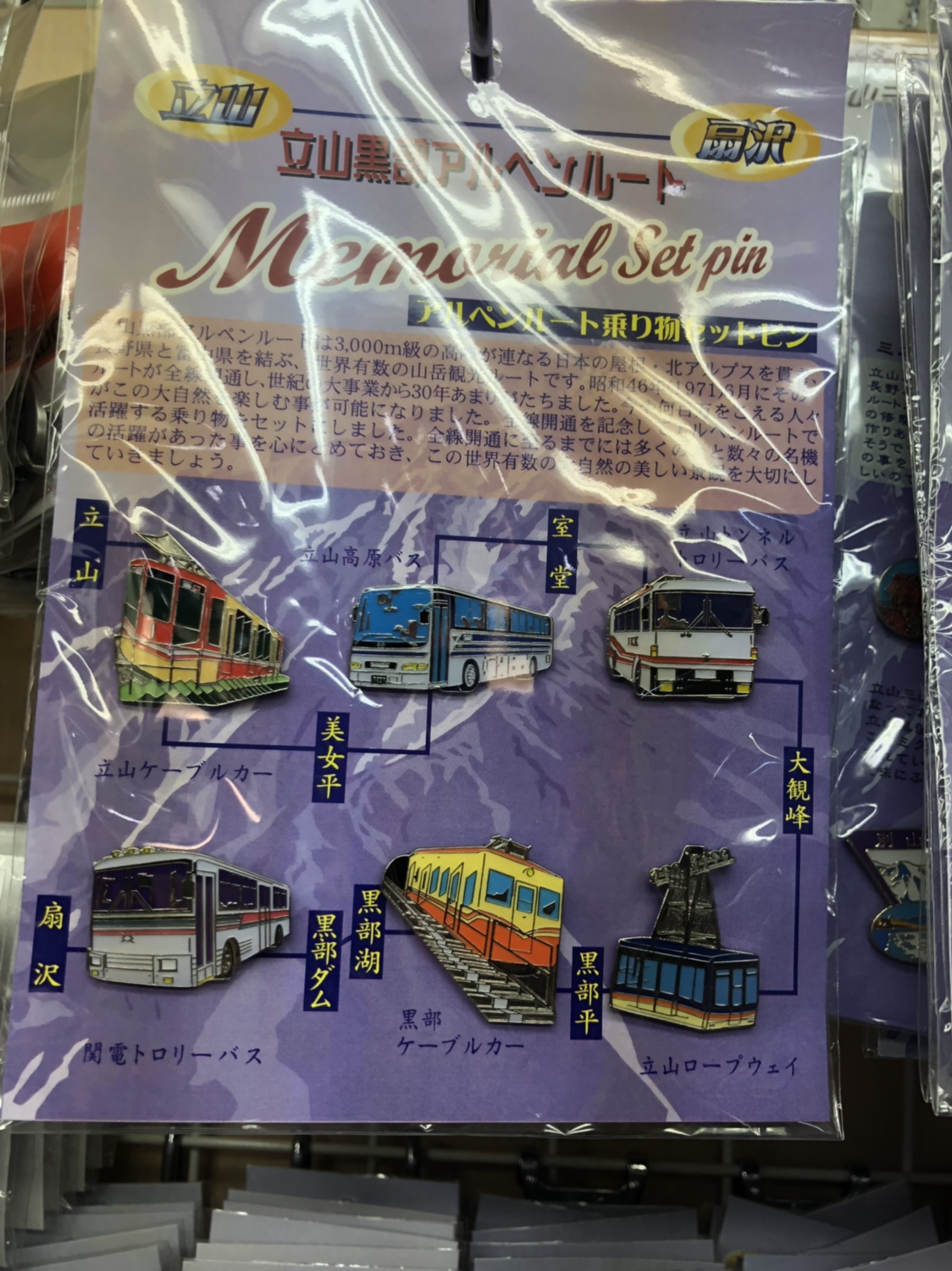 -알펜루트를 통과하기 위한 교통수단을 주제로 한 기념품이 많다. 각 교통수단의 배지, 교통편을 그린 케이크 원통형 케이크, 맥주 등 지역에서만 구입 가능한 것들이 있다.