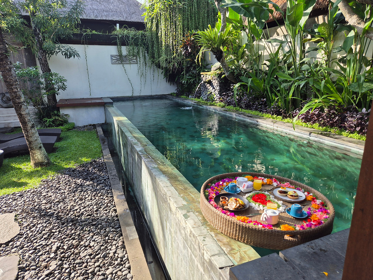 일단 잠도 덜 깨서 수영복을 챙겨 입고 수영장에 뜬 낙엽을 치우는 직원을 맞고, 짐을 한가득 들고 와서 바구니에 꽃을 뿌리고 음식을 올리는 직원들을 무시하지도 못하고 지켜보지도 못하고 안절부절하는 과정이 전부 민망했다.