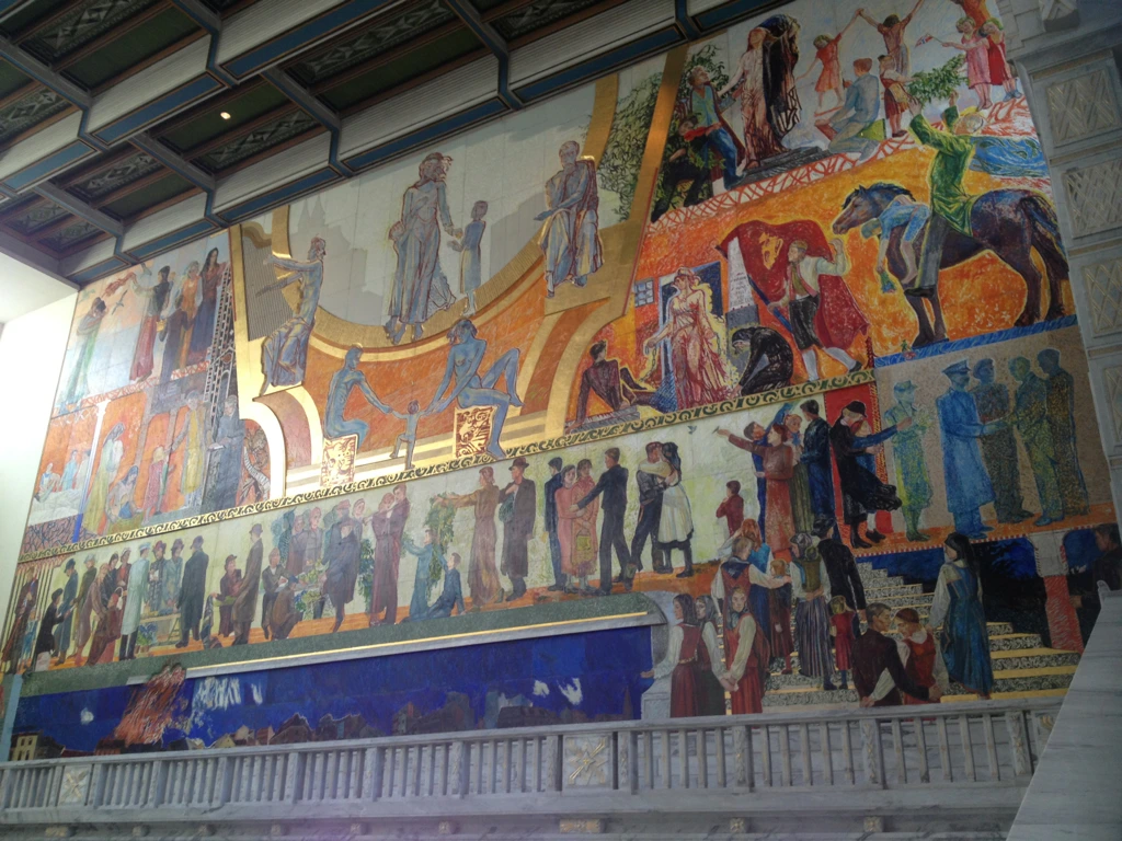 노르웨이의 역사적 사건과 국민들의 모습이 담긴 작품이 벽을 감싸서 장엄한 화려함이 느껴진다.