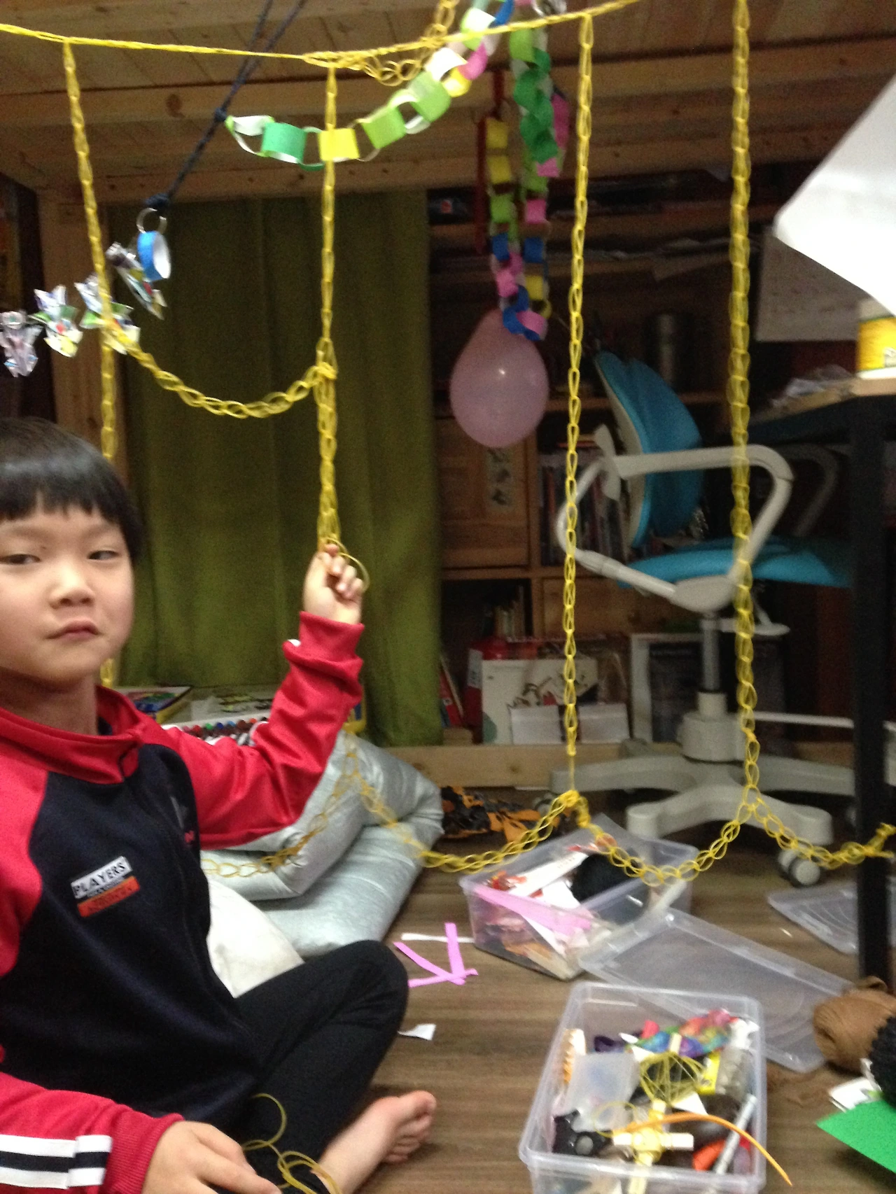 털실을 묶고 연결해서 만드는 방 한가득 거미줄