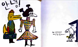 문을 열어보니 춤추는 공룡이 서 있습니다.
