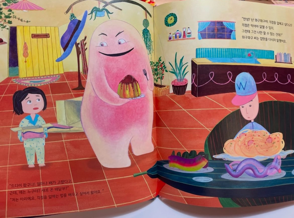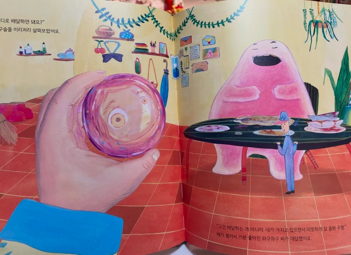 아이들의 걱정을 먹던 와구와구씨는 ‘불안 구슬’은 소중하다며 다시 아리에게 건네줍니다.