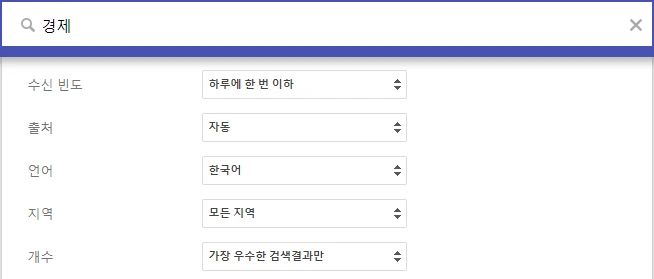 설정 화면에서 수신 빈도나 출처, 언어, 지역, 개수, 그리고 개인 이메일(gmail)로 받을지, RSS 피드로 받을지를 선택할 수 있는 옵션이 있다.
