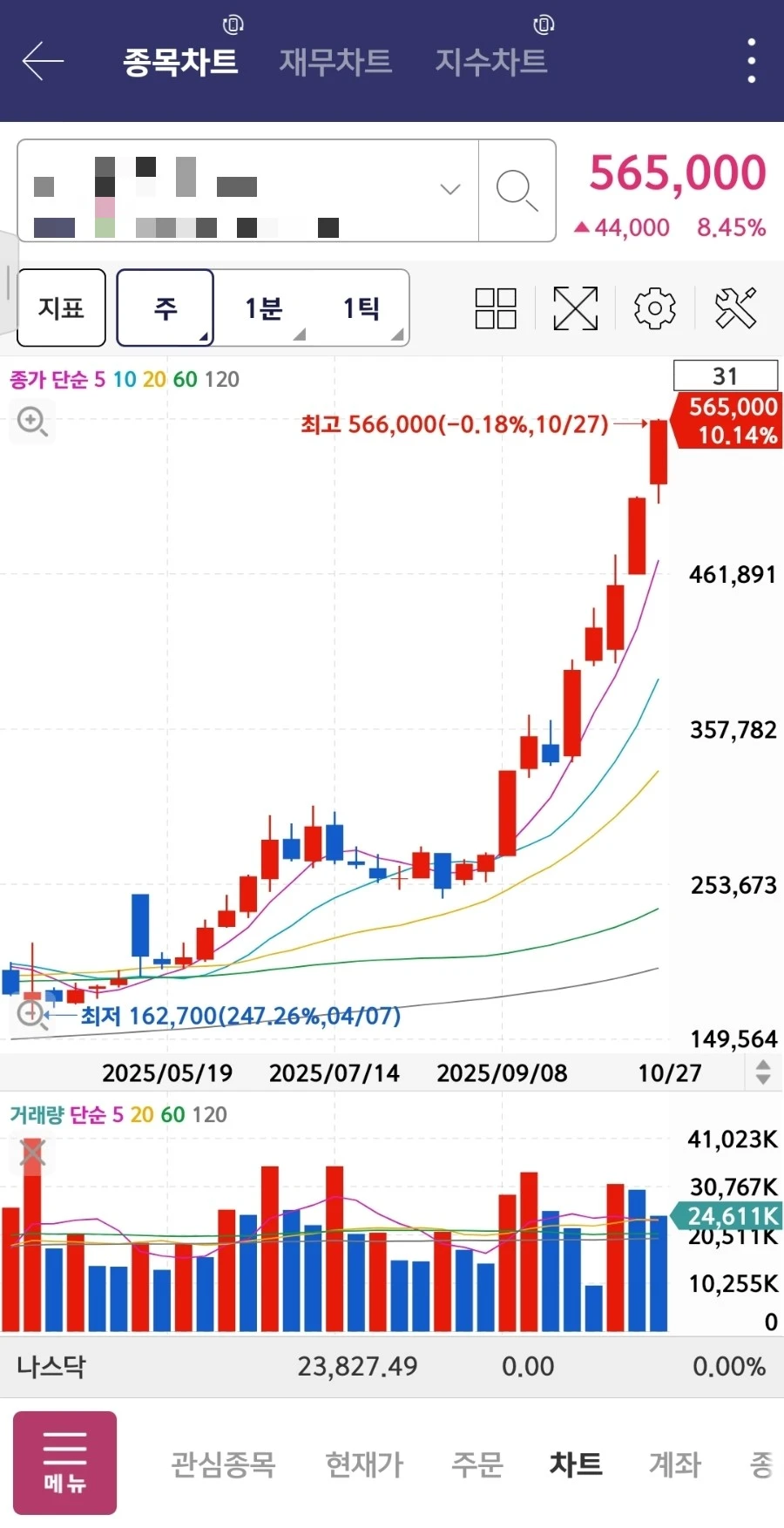 평소의 나라면 S*과 삼*을 벌써 팔았어야 했다. 매일 경신하는 수익률과 우뚝 솟는 빨간 막대를 보는 것이 흐뭇하기는 했지만, 반대로 언제 다시 떨어질지 몰라서 드는 조바심도 만만치 않았다. 하지만, 아직은 팔지않고 가지고 있다.