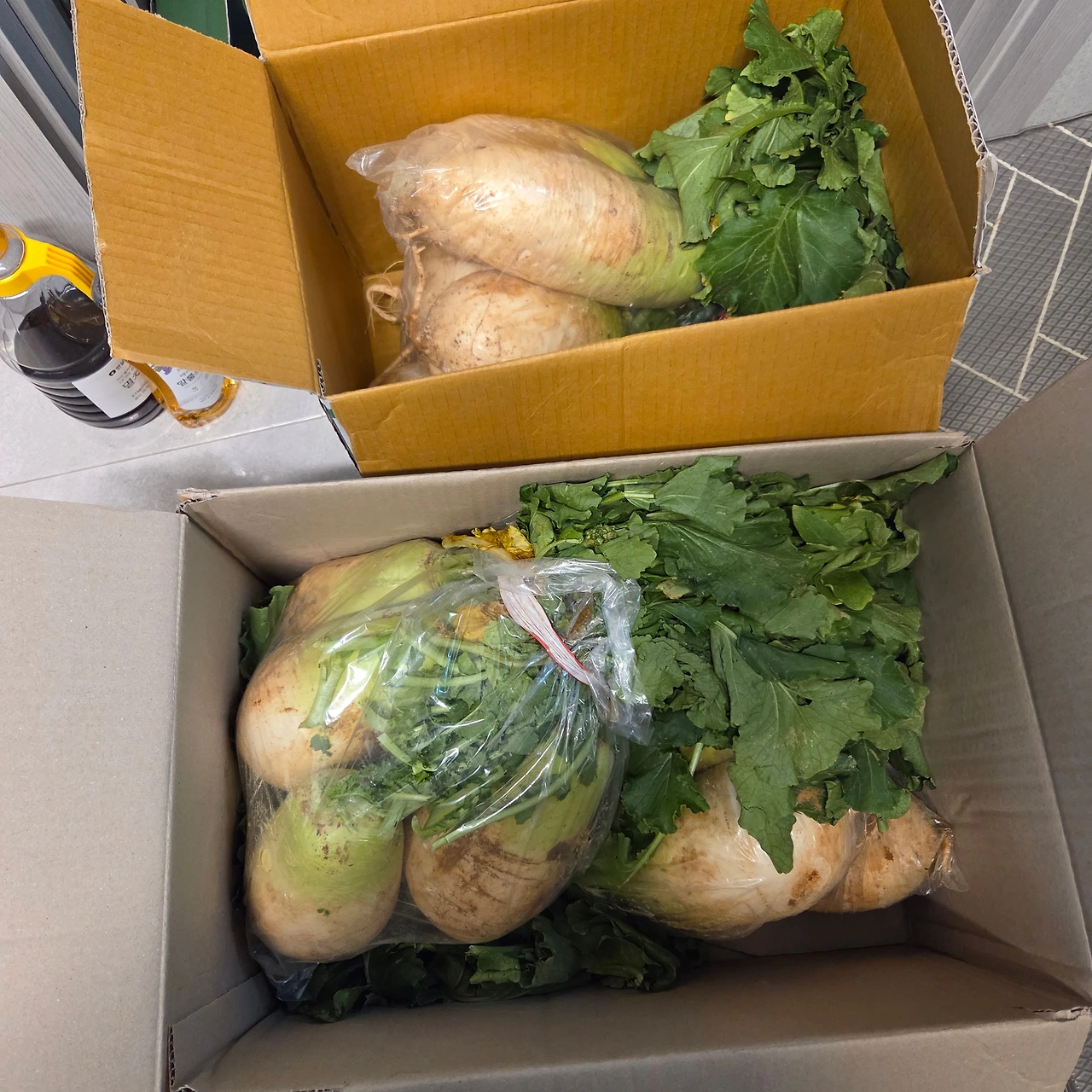 다행히 마트에서도 김장무를 팔고 있었다. 반가운 마음에 석단을 집어들었다. 그런데 무 다발이 너무 무거워서 쇼핑카트에까지 옮기는 것도 엄청나게 힘들었다. 장바구니에 무 석단을 꾸역꾸역 밀어넣고 배달접수를 하러 접수대로 갔는데, 그런 상태로는 배달이 불가하다고 거절당했다. 무청이 안보이도록 박스에 포장을 다시 해와야 한단다. 게다가 박스를 테이프로 단단히 붙여야만 배달이 가능하단다.