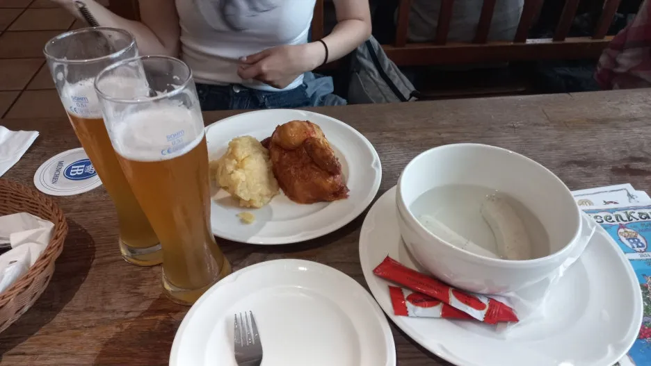 호프브로이에 들어서자 사람들도 많고 밴드의 음악소리도 커서 흥이 났다. 길다란 테이블에 다른 사람들과 합석을 했다. 알코올의 힘인지 처음 보는 사람들끼리도 술잔을 들고 눈으로 건배를 했다. 독일식 정통 소세지인 바이스부어스트와 구운 닭고기, 감자를 주문했다. 물론 바이에른 지방의 정통 맥주인 바이스비어도 같이 주문했다. 너무 맛있었다. 맛으로 먹고 분위기로 먹고, 술을 거의 먹지 않는 딸내미도 한잔을 거의 다 비웠다.