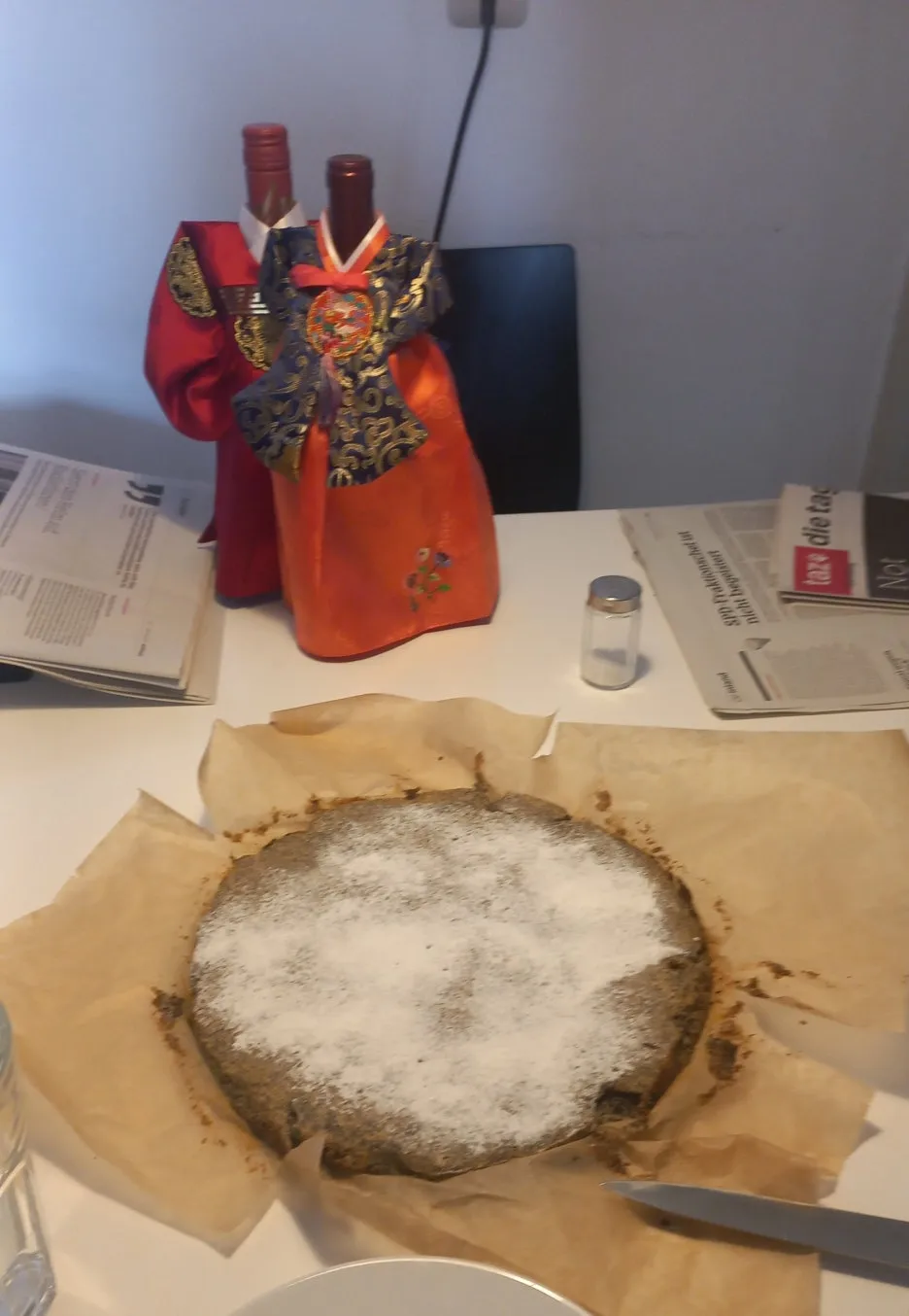 약속시간과 장소를 정하는데 지금도 예전의 그 집에서 아직 살고 있다면서 집으로 오라고 했다. 한국에서 미리 준비해 온 선물(한복 와인커버)과 어제 산 와인 두병을 들고 갔다. 예전에도 한번 놀러가 본 적이 있어 동네와 집을 쉽게 찾았다. 벨을 누르자 문을 열어주어 계단을 올라가는데 몇 층이었는지가 기억나지 않았다. 문 앞에 붙은 이름을 하나씩 확인하며 윗층으로 올라가는데 A가 문밖에 마중을 나와 있었다.