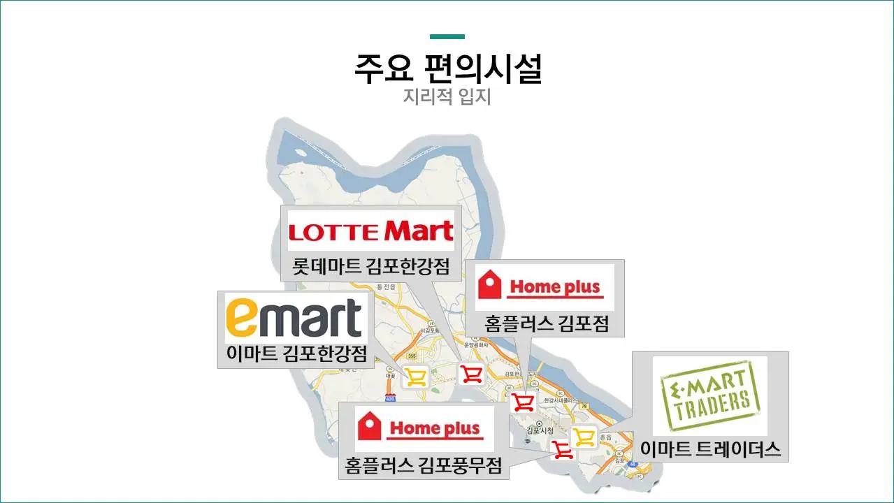 김포시에는 총 두개의 홈플러스가 있습니다. 북변동에 위치한 김포점과 서울과의 접근성이 좋은 풍무점을 들 수 있는데요. 풍무점은 특히 서울과의 접근성이 좋은 위치에 자리하고 있죠. 여기에 최근 새롭게 오픈한 창고형마트 이마트 트레이더스까지, 다양한 편의시설들이 대부분 서울과 가까운 김포 지역에 밀집되어 있는 것을 확인할 수 있는데요. 이는 그만큼 김포내 특정 지역들의 인구 밀도가 높고, 왕래가 많다는 의미로도 해석할 수 있겠습니다.