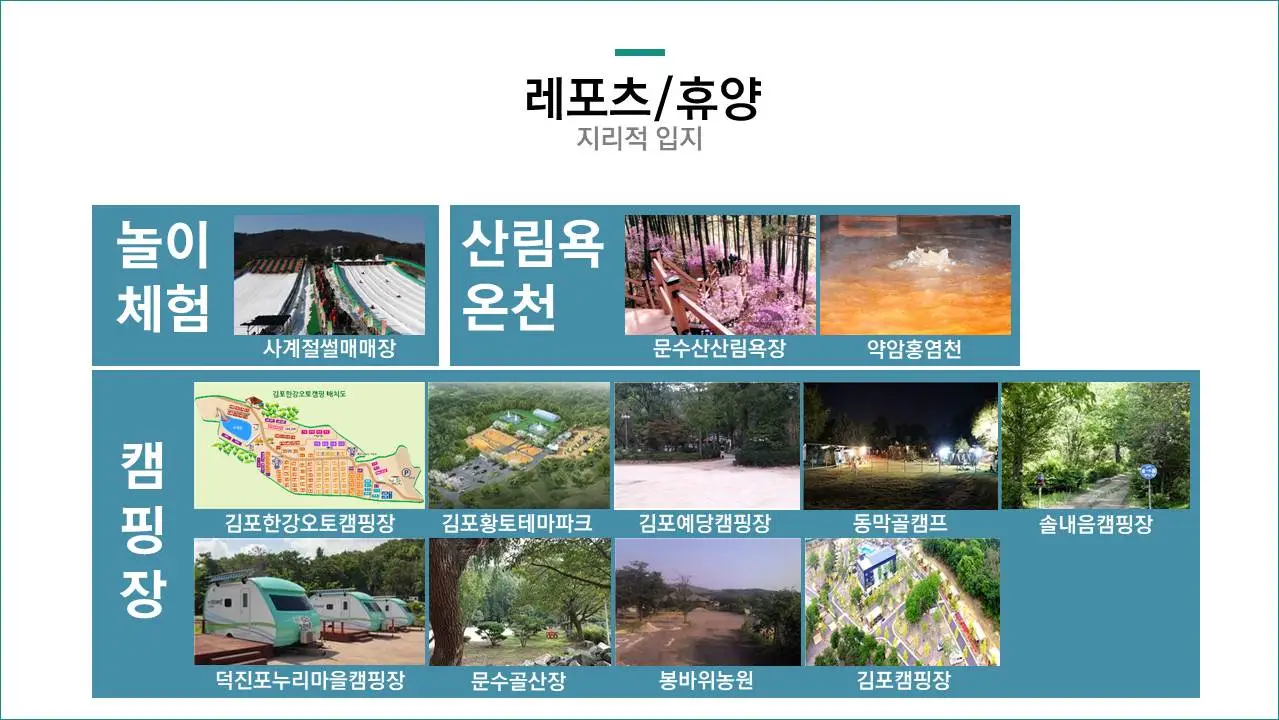 박물관이나 전시관 등의 실내시설 외에도 야외에서 레포츠를 즐길 수 있는 휴양시설들이 다양하게 마련되어 있습니다. 대표적인 한강오토캠핑장을 비롯해, 김포 내에는 의외로 많은 캠핑장들이 마련되어 시민들의 여유로운 여가 생활을 도와줍니다.