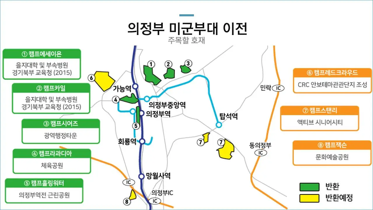 이미지를 통해 확인하실 수 있듯, 의정부에는 의외로 미군부대들이 차지하고 있던 대지들이 많은데요. 의정부 곳곳에 자리하고 있던 부대 부지에는 을지대와 병원이 들어올 예정입니다.