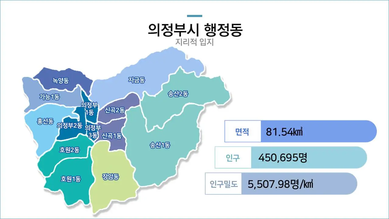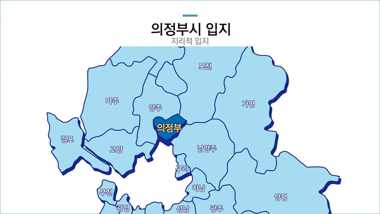 가장 먼저 지리적 입지를 살펴보겠습니다. 의정부시는 서울 북부권에 위치한 지역으로, 제 2외곽선의 연결라인에 들어가는 입지입니다. 때문에 관심있게 살펴볼 필요가 있는데요. 고양시 등 인근 지역에 비해 절반이 채 되지 않는 면적이지만, 인프라가 부족하지 않고 주거지로서의 기반시설들이 잘 갖춰져 있습니다.