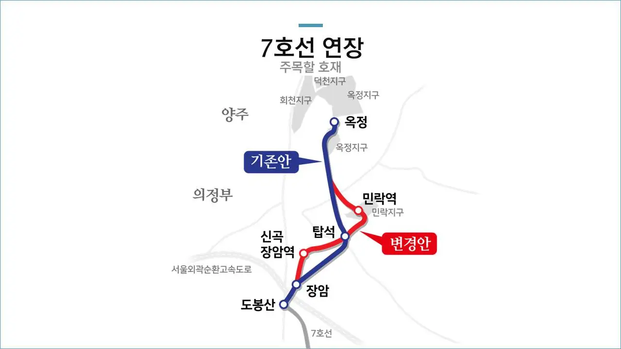 7호선 연장 계획 역시 의정부의 주목할만한 호재입니다. 하지만 기존의 계획안은 유동인구나 인프라가 적다는 의견이 있어, 수정된 변경안으로 연장이 이루어질 것으로 보이는데요. 현재는 주택이 밀집되어 수요층이 많은 신곡동과 유동인구가 풍부한 민락지구가 후보지로 올라와있지만, 보다 구체적인 계획이 나오기까지는 시간이 필요할 것으로 보입니다.