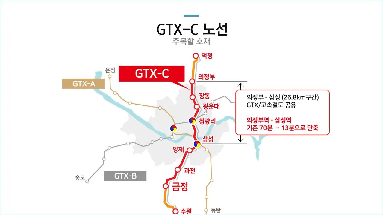의정부역에서 삼성역까지는 지하로 이동하는 새로운 노선이 생겨나고, 의정부역에서 덕정역까지는 기존의 지상철 노선을 이용할 예정인데요. 기존에 70분 가량이 소요되던 의정부역-삼성역 이동 시간이 GTX 완공후에는 13분으로 단축될 전망이라고 하니, 정말 획기적인 변화가 되겠습니다.