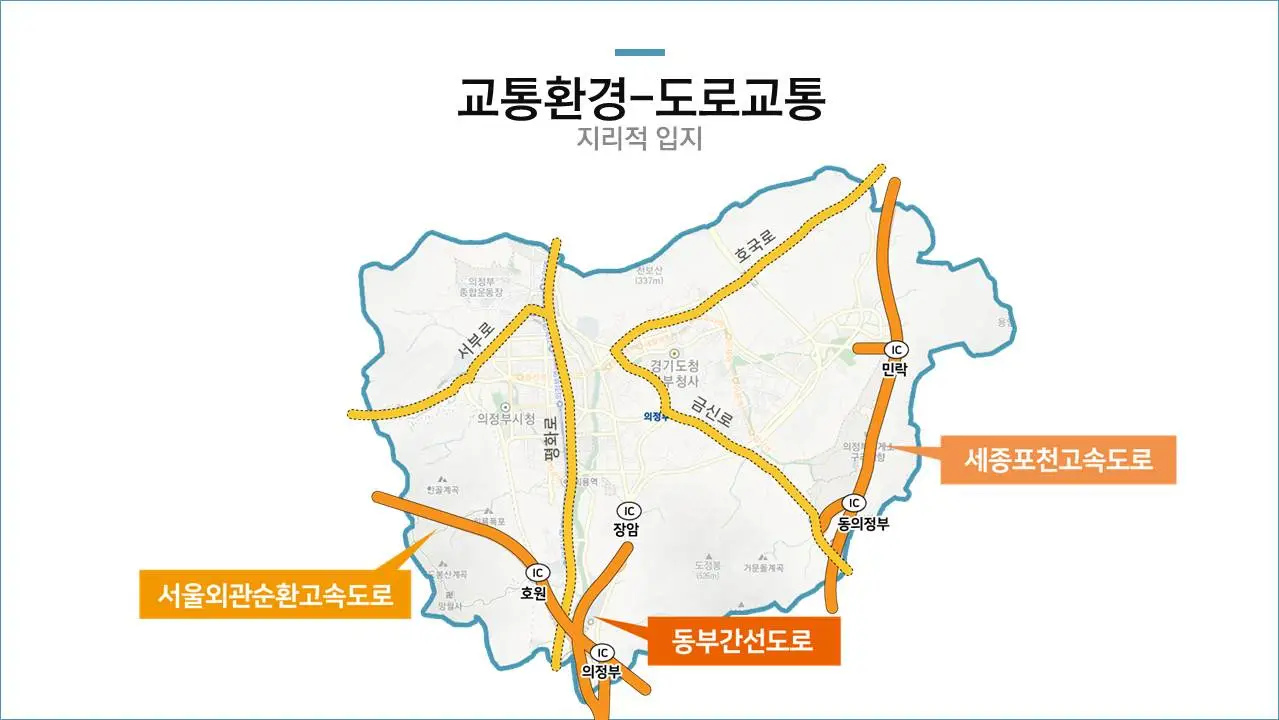 의정부는 서울외곽순환고속도로와 인접해, 경기도 안에서도 교통편이 좋은 축에 속합니다. 평화로를 이용하면 서울 중심부로 빠르게 진입 가능하고, 세종포천고속도로를 이용해 경기 외곽 지역으로도 이동이 편리합니다.