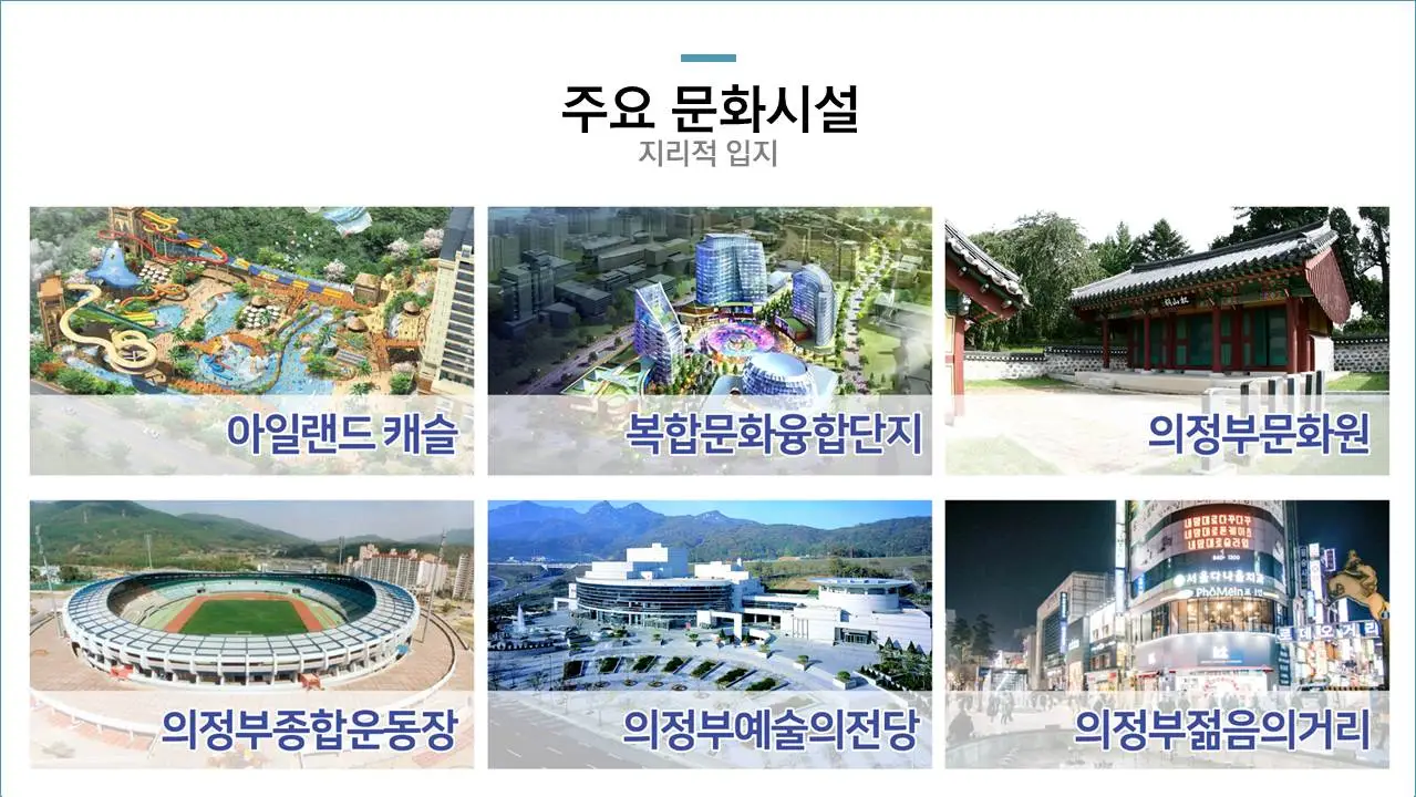 주요문화시설로는 의정부역 젊음의 거리를 꼽을 수 있습니다. 가능동에 위치한 종합운동장과 시청 옆 예술의 전당, 조성을 앞두고 있는 복합문화융합단지, 장암IC 근처의 아일랜드캐슬 정도가 주요 문화시설이라고 할 수 있겠습니다.