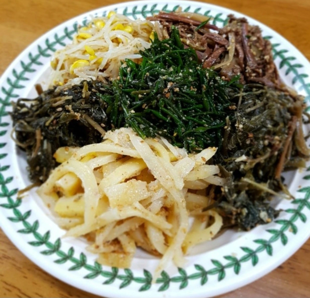 나물에 쓱쓱 밥을 비벼 한 숟가락씩 주신다.