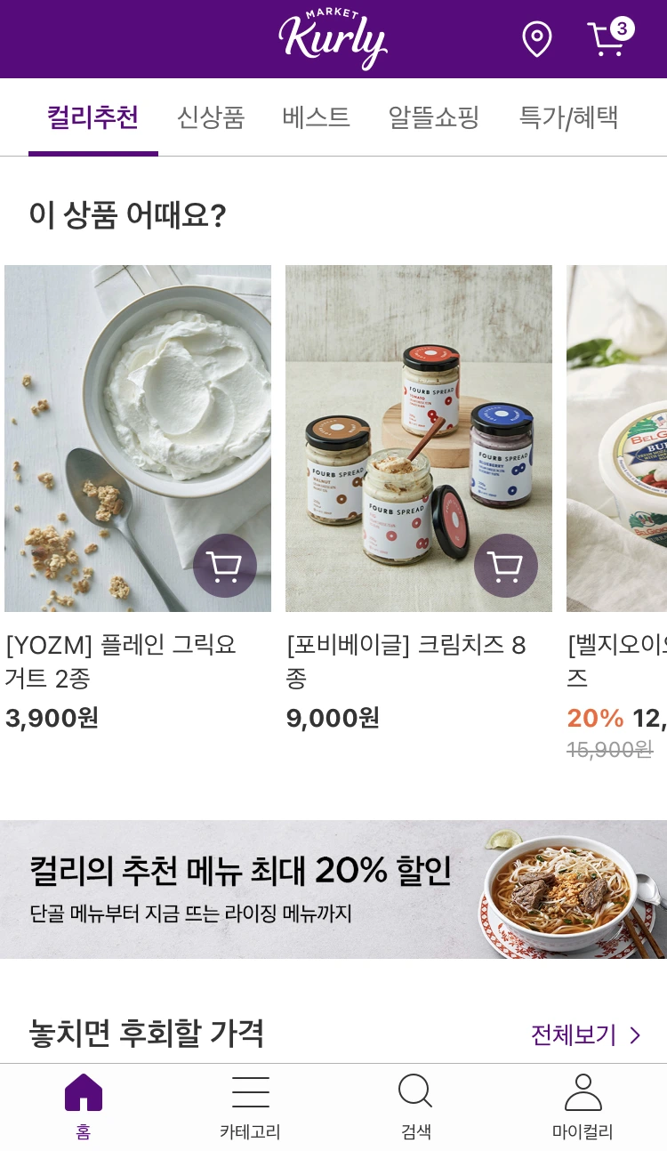 홈 화면 상단에서 "이 상품 어때요?"라는 섹션을 바로 볼 수 있는데 이전에 마켓컬리에서 봤거나, 검색했거나 하는 행동에 따라 바뀌는 걸 확인할 수 있었다. 최근 그릭요거트와 크림치즈에 빠져.. 며칠 전에 마켓컬리에서 검색 후 좀 둘러봤는데, 오늘 앱을 실행하니 바로 이전에 검색했던 카테고리의 상품들을 노출해줘서 고객 관리(?)를 받고 있는 듯한 느낌이 들었다.