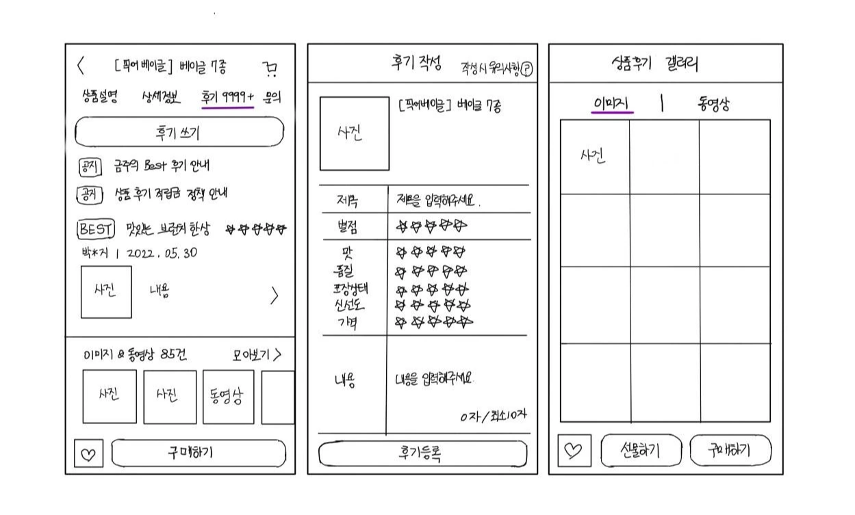 상품 후기 등록 시 별점 평가 기능을 도입하고 후기의 세부적인 탐색 시 포장상태, 품질, 맛 등 제품군에 맞는 간단한 평가 기준을 추가해야 한다. 또한 사진 및 동영상 리뷰 모아보기 기능이 제공된다면 제품 이미지를 한 번에 확인할 수 있어 훨씬 편리할 것이다.