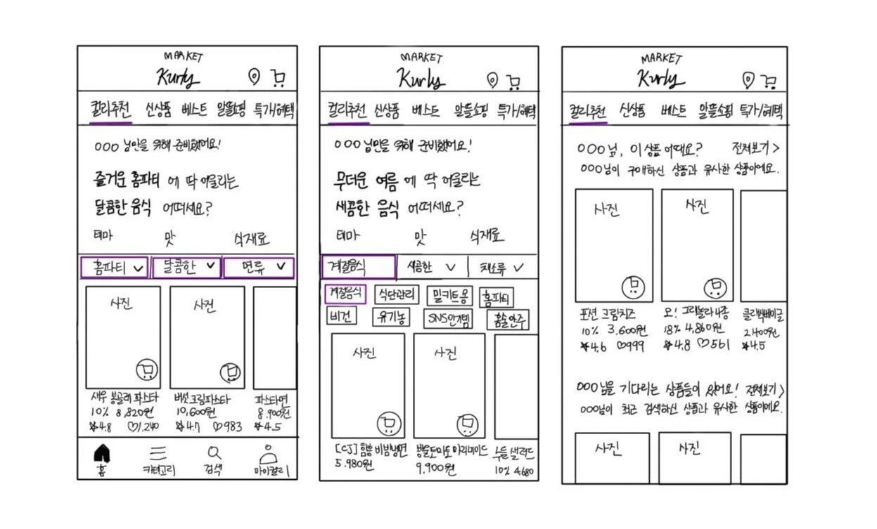 이 같은 자신의 취향에 적합한 상품들을 추천받고, 다른 유저들의 상품 후기들도 편리하게 비교해보며 구매 결정을 하고 싶다는 니즈를 가지고 마켓컬리에 접속한다.
