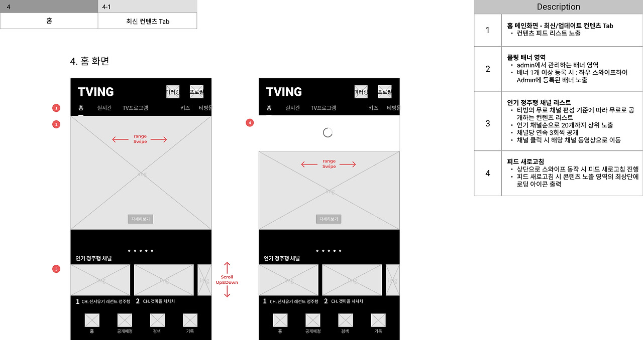 Figma를 이용해 와이어프레임을 그려보았으니 와이어프레임의 각 기능들의 요소와 인터랙션이 어떻게 구현되어야 하는지 설명하는 화면 설계서도 같이 작성해보며 실습하는 것이 좋을 듯 했다. 실무에서는 제품을 개발하기 위한 최종적인 기획 산출물이 화면 설계서이기 때문에 각 기능이 명확하고 상세하게 설명되어야겠지만, 이번 포스팅에서는 간단히 '홈 화면'의 Description을 작성해보았다.