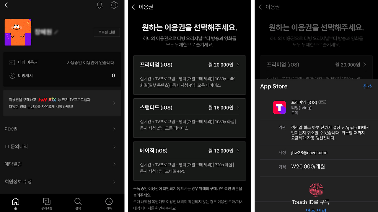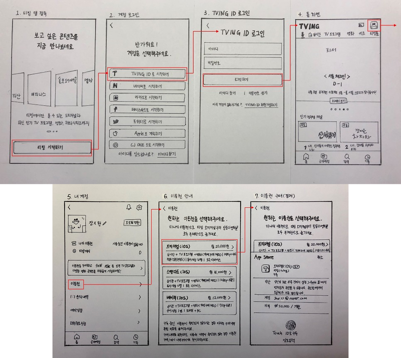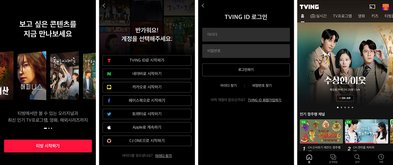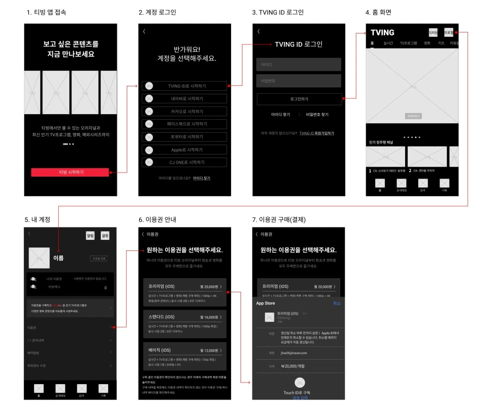 티빙 앱 접속 → 회원가입(계정 로그인) → 홈 화면(내가 보고 싶은 콘텐츠 확인) → 내 계정 → 이용권 선택 → 이용권 구매