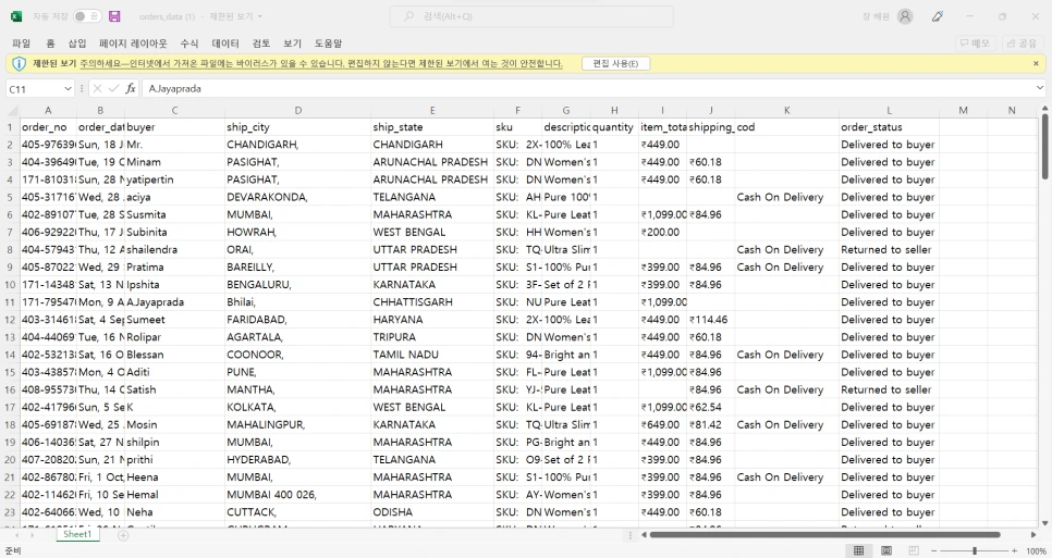order_no(고유 주문 번호), order_date(주문 날짜), buyer(구매자명), ship_city(배송 도시), ship_state(배송 주소), sku(제품 식별부호), description(제품 설명), quantity(주문 단위수), item_total(구매자가 지불한 총금액), shipping_fee(배송비), cod(결제수단: 착불 여부), order_status(주문 상태)