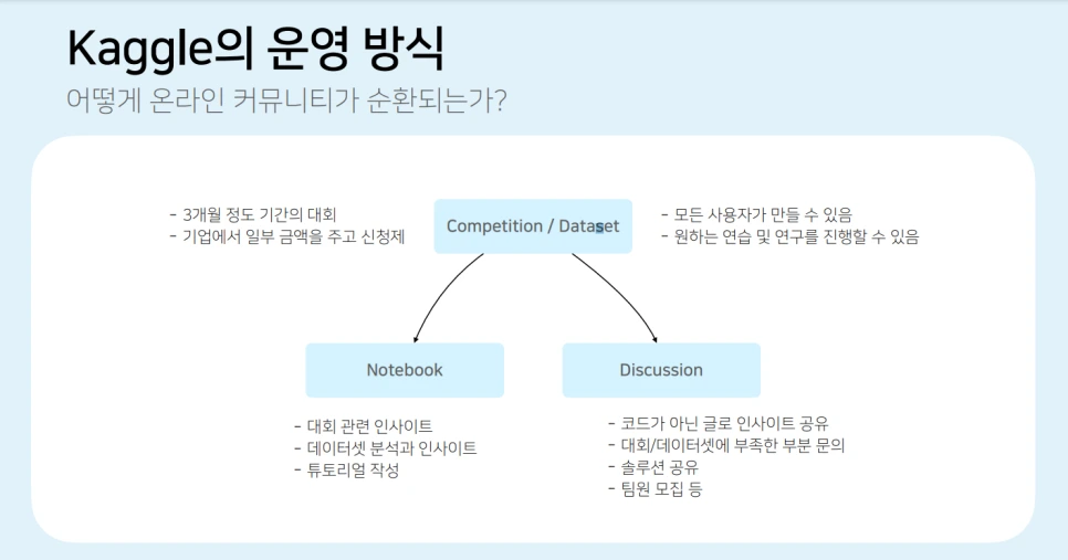 캐글(Kaggle)이라는 사이트는 Data Science Competition 플랫폼으로, 데이터 사이언티스트와 머신러닝 학습자들의 온라인 커뮤니티이다. 공개 데이터를 바탕으로 데이터 분석을 연습해보고 서로 공유하는 포럼 형식의 사이트인데 운영 방식은 아래 사진을 참고하자.