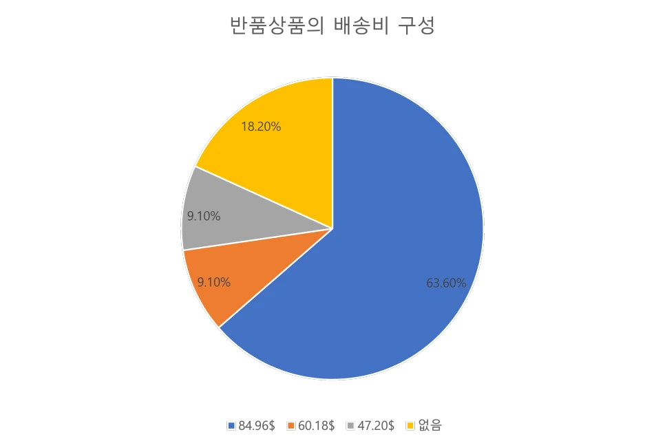 '배송비가 비쌀수록 반품 가능성이 높을 것이다'라는 가설을 검증하기 위해 반품 상품과 배송 완료된 상품을 구분하여 배송비 구성이 어떻게 되는지 살펴보았다. 반품 상품을 배송비가 높은 순에 따라 확인해 보았을 때 배송비 84.96$인 상품이 7개(63.6%)로 가장 많았고, 60.18$와 47.20$가 각각 1개, 배송비 없음이 2개였다.