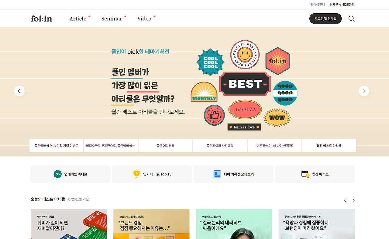 커리어, 브랜딩, 스타트업, 포스트 코로나 등 시의성에 맞는 다양한 테마를 선정한 후 링커라고 부르는, 현업에서 일하는 연사를 초빙한다. 이후 200~300명 대상의 폴인세미나 혹은 20~30명의 소그룹이 3개월 동안 하나의 테마를 공부하는 폴인스터디를 유료로 운영한다. 그렇게 이루어진 활동과 인사이트 등을 정리하여 폴인멤버십이라는 유료 멤버십 형태로 아티클, 뉴스레터 등의 콘텐츠를 제공하고 있다.
