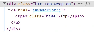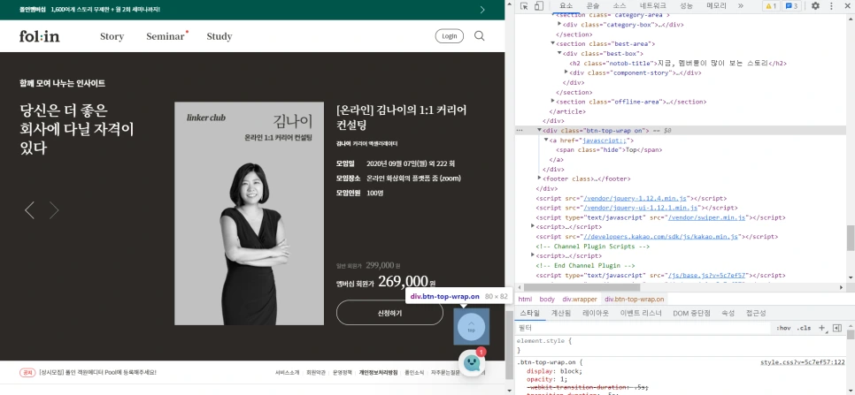 "btn-top-wrap on" 버튼에 자바스크립트가 적용되어 있다. 화면 상단에 있을 때는 버튼이 숨겨져 있다가 스크롤을 내리면 버튼이 생성된다.