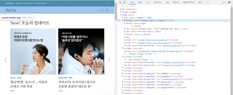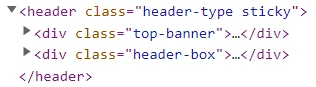 폴인의 HTML 요소를 보면 <header> 코드 안에 <top-banner>, <header-box>로 구성되어 있다.