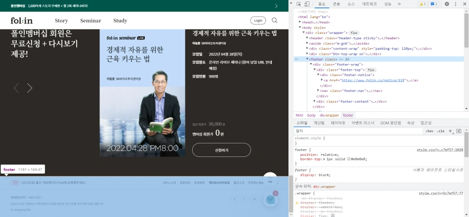 그리고 <footer-top> - <footer-notice>에서 '[상시모집] 폴인 객원 에디터 Pool에 등록해주세요!' 문구가 위치했으며, 클릭하면 객원 에디터 상시모집 페이지로 이동할 수 있었다.
