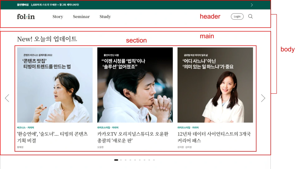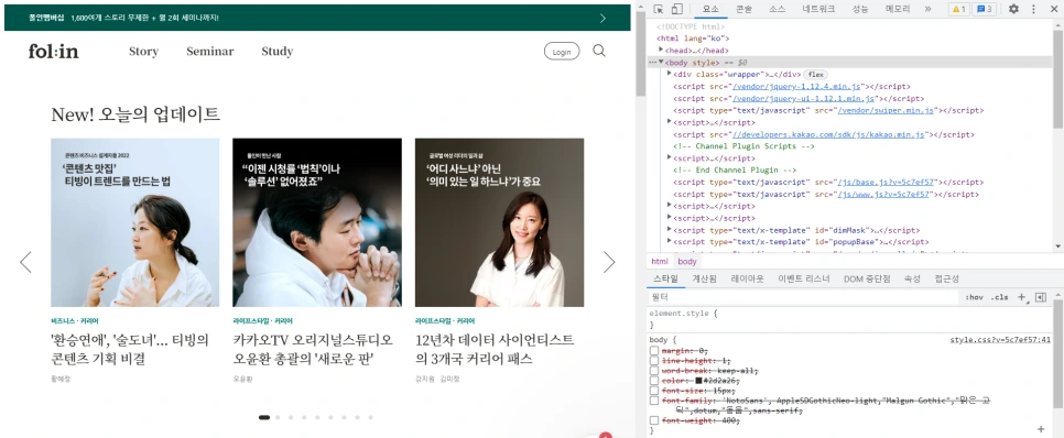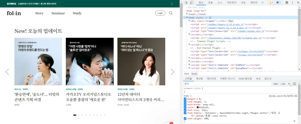 그래서 오늘은 'fol:in(폴인)'의 랜딩 페이지에 담긴 프론트엔드 요소들을 분석해보고 어떻게 구성되어 있는지 살펴볼 것이다.