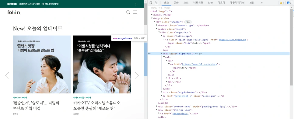 그리고 왼쪽 화면 최상단을 보면 <aside class="m-gnb">라고 나와있는 것으로 보아 랜딩 페이지의 aside는 모바일에 적용된 네비게이션 바를 담고 있음을 알 수 있었다. 모바일로 폴인에 접속할 경우 aisde(사이드 바)를 확인할 수 있는 것이다.