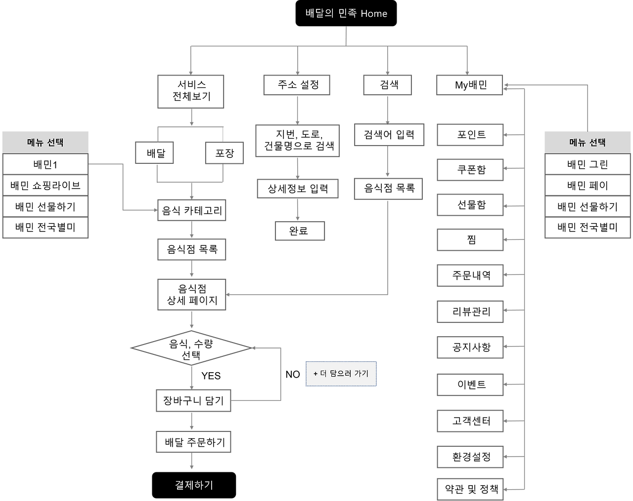 메인 홈 상단 배너를 기준으로 다른 메뉴로 이동할 수 있는 플로우를 그린 것이기에 배달의민족의 모든 기능의 플로우를 담지는 못했지만 음식을 배달/포장 주문하려는 유저의 입장에서 꼭 사용해야 하는 기능들을 포함하여 서비스 이용 프로세스를 나타냈다.