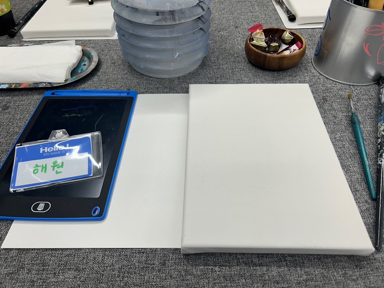 금요일 오후 6시 40분. 카페에서 Y와 나는 먼저 만났다. 오랜만에 보니 더 반가웠다. 커피를 하나씩 테이크아웃해서 7시쯤 모임장소로 갔다. 이미 사람들이 많이 와 있었다. 우리는 가방과 겉옷을 보관하고 앞치마를 건네받았다. 책상 위에는 캔버스와 붓, 아크릴 물감, 이름표, 간식 같은 것들이 놓여있었다.