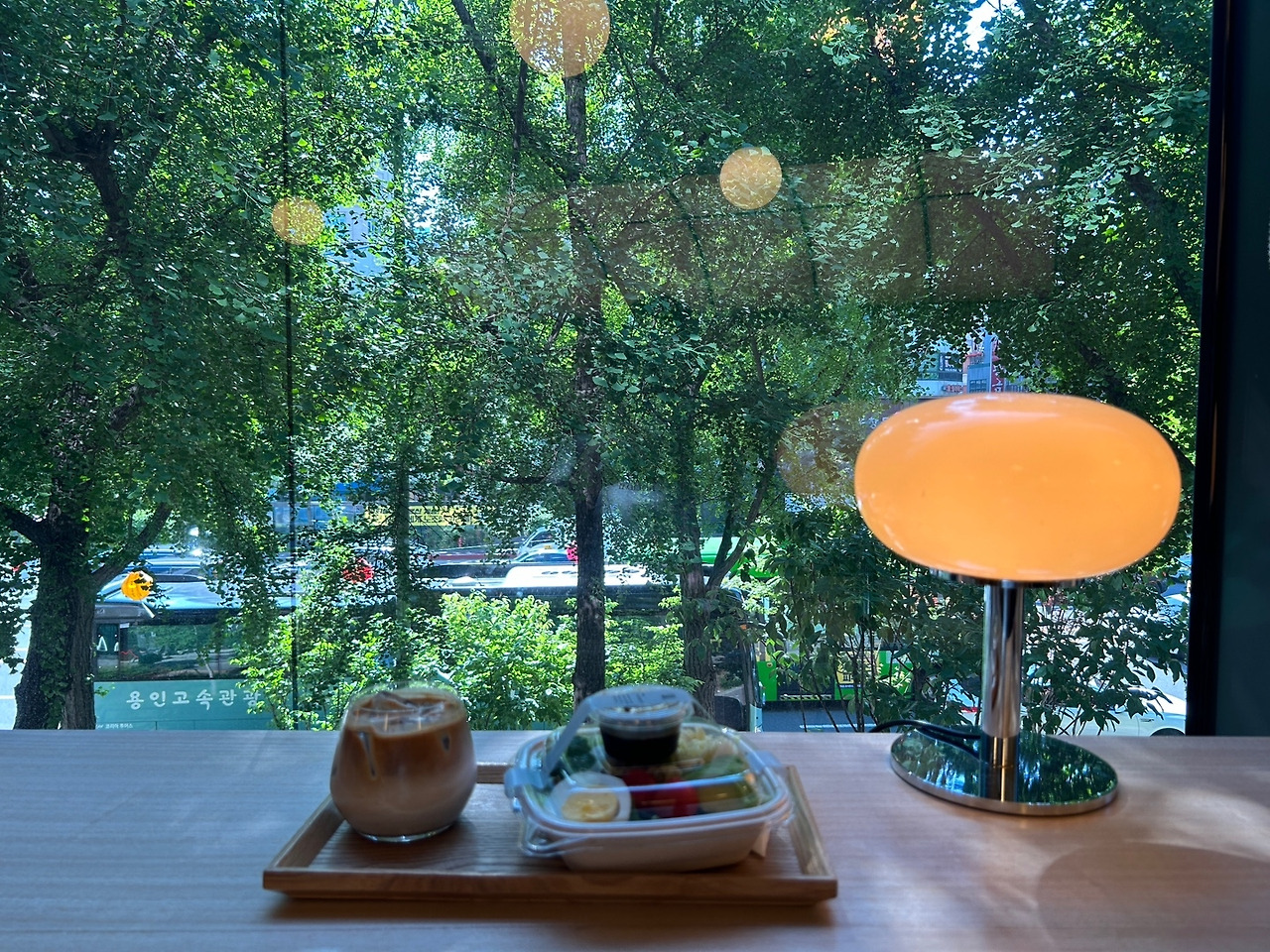 카페 내부를 자세히 보니 4층으로 운영되는 카페는 층별로 공간의 이름이 붙여져 있었다. 1층부터 4층까지 시간의 맛, 사적인 쉼, 쉼의 공간, 문화의 방. 시간과 쉼, 공간이라는 단어를 누가 이렇게 적절히 배치해 놓았을까 생각하며 나는 2층 사적인 쉼으로 들어갔다. 창가를 따라 기다랗게 배치된 높은 테이블 위에 앙증맞은 샛노란 조명이 인상적이었다. 탁 트인 창밖으로 늦봄의 정취가 가득한 가로수가 한가득 시야에 담겼다.
