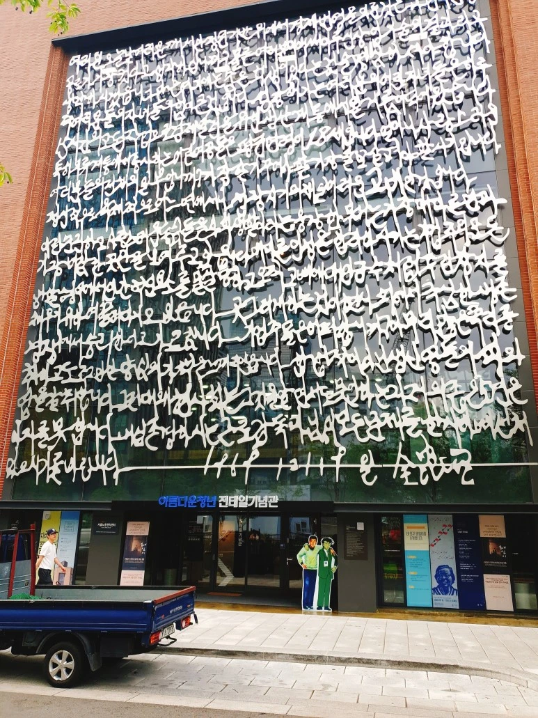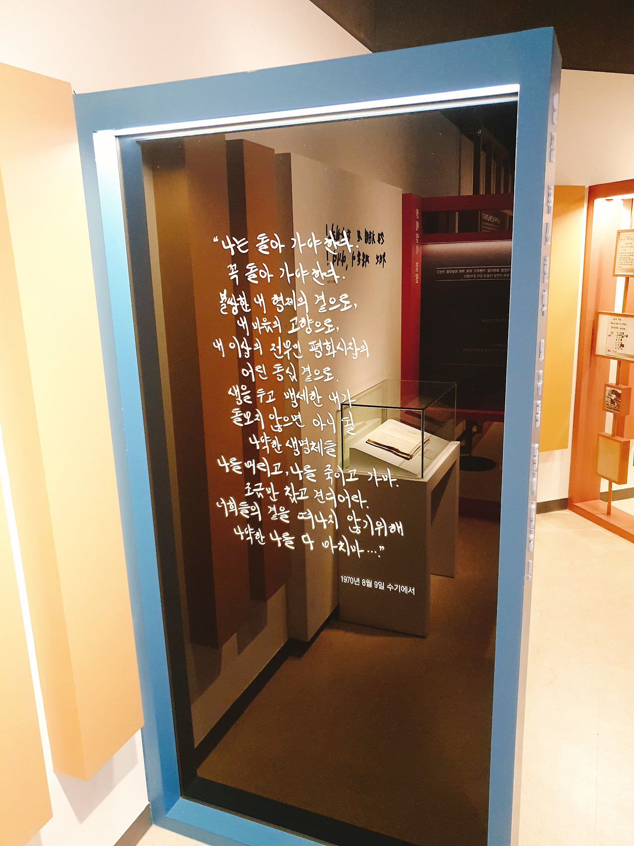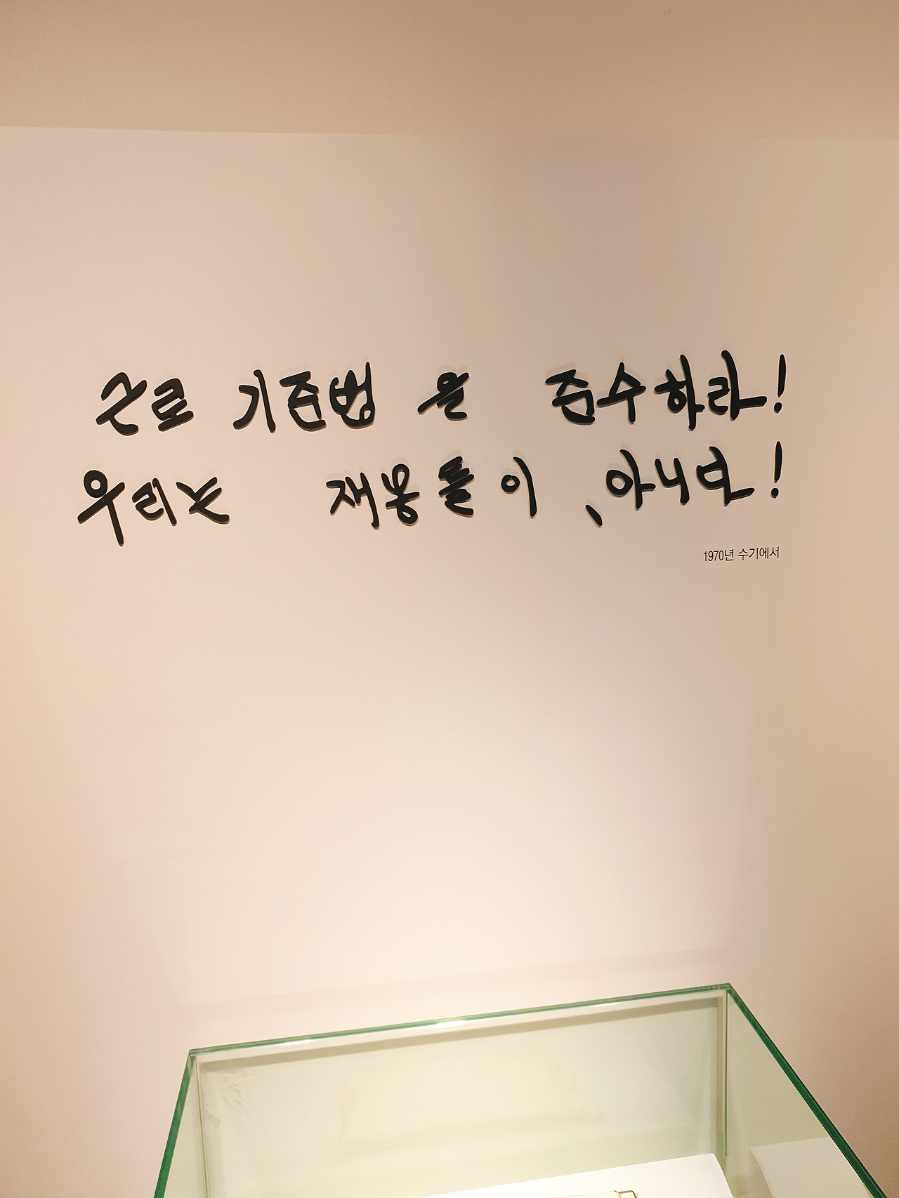 전태일 기념관의 외벽에는 근로감독관에게 보낸 진정서의 문장이 쓰여있다.