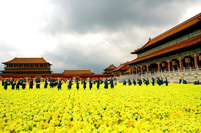 영화 <황후화>에서 권력을 생산하고 권력이 머물며 권력이 소비되는 공간인 자금성은 온통 금색이다. 눈을 뜨면 보이는 궁궐 내의 모든 벽은 온통 금빛으로 칠해져 있다. 국화를 수 놓는 황후의 자수도 온통 금색이며, 궁의 마당은 노란색의 국화가 가득 채우고 있다.