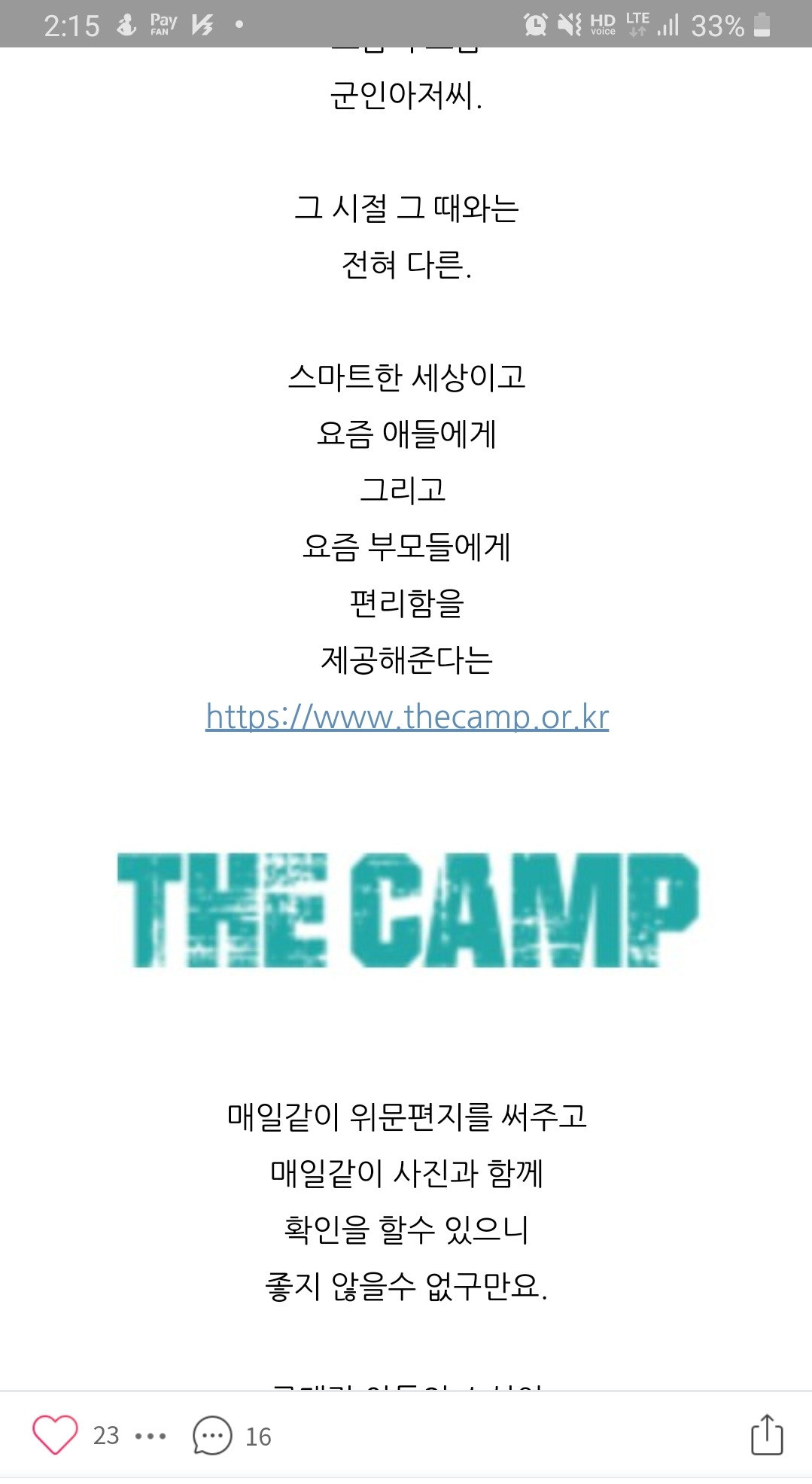 요새는 종이로 쓰는 위문편지는 못 보내도, THE CAMP라는 어플 깔면, 위문편지 쓸 수 있고, 가족간의 소통도 자유롭단다.