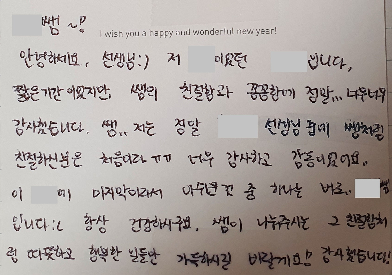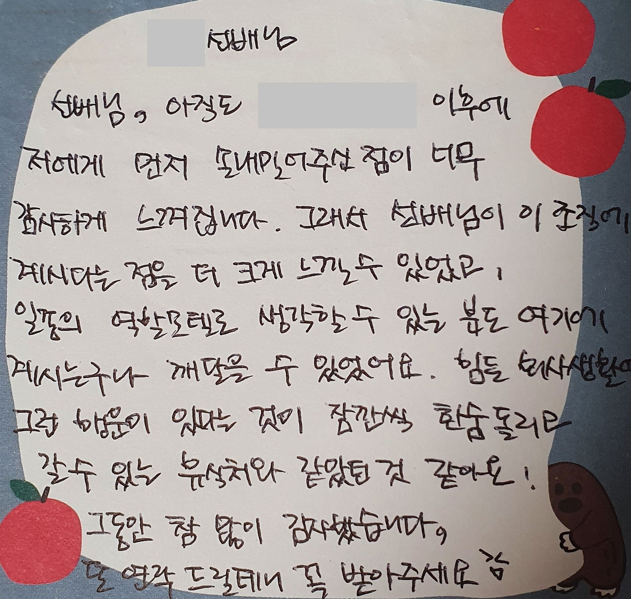 좋은 사람들과 더 오래 함께 일하기 위해 고민하던 나의 노력이 그래도 헛되지 않았다는 걸 나중에 알았다. 퇴사하는 몇몇 후배들이 마지막 선물로 내게 손 편지를 건네주었기 때문이다. 먼저 손을 내미는 용기, 잠시 시간을 내는 일, 관심과 친절 같은 사소한 것들이 그때의 나에게 좋은 추억으로 남았다.